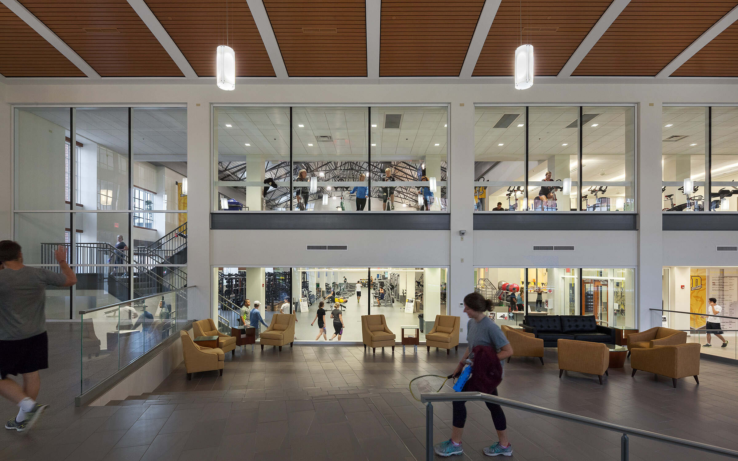In the first of a three-phase project, our team expanded and renovated the nearly 59,000 SF Lilly Center to address the University’s top priorities related to fitness, training facilities and recreational programming. The most noticeable change is the addition of a lobby to the front of the existing building to align the building with the walkway and create a prominent campus front.