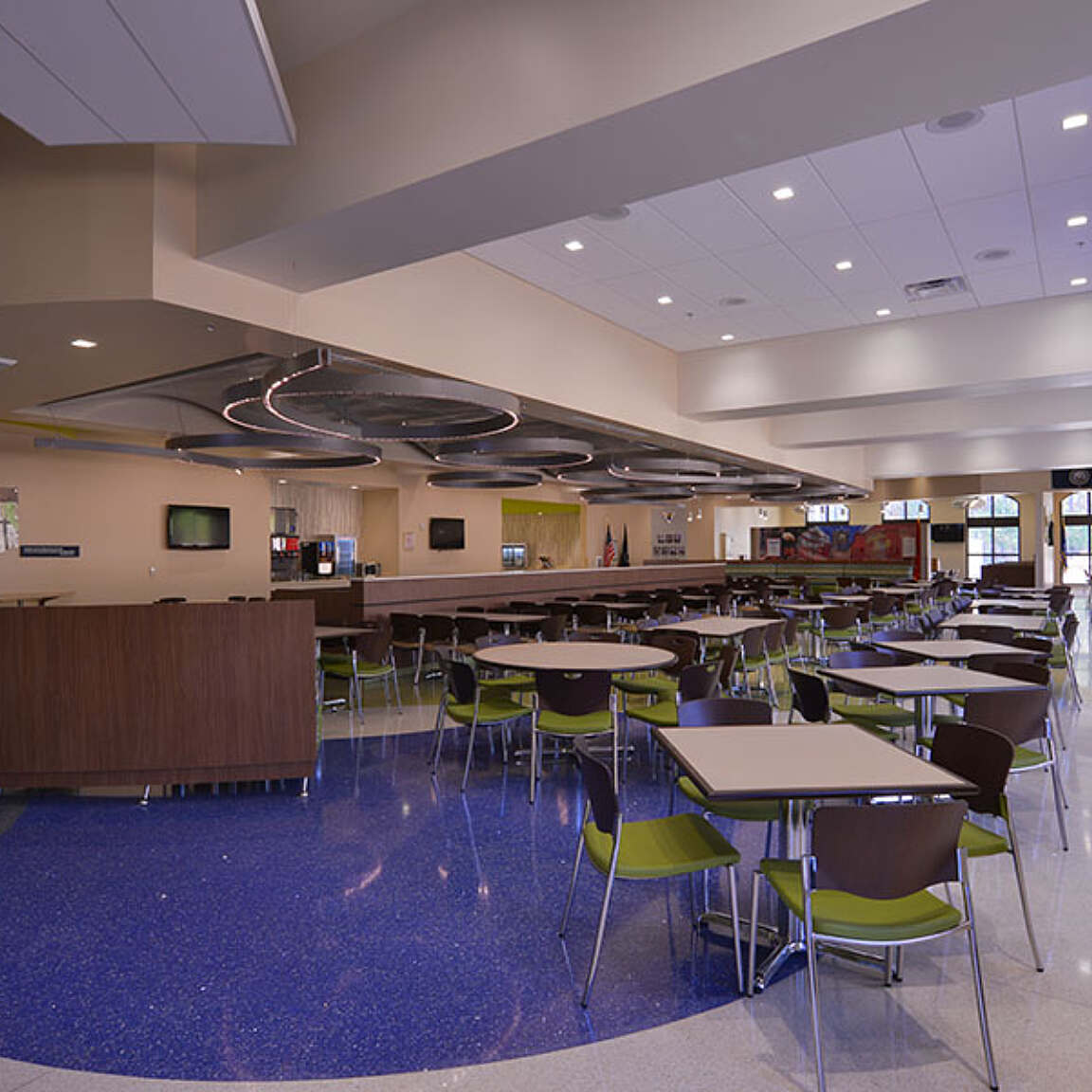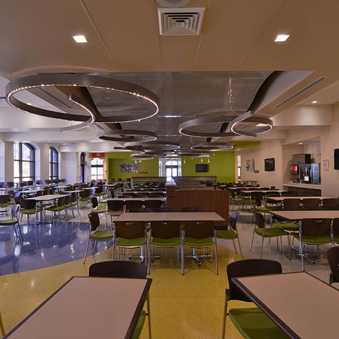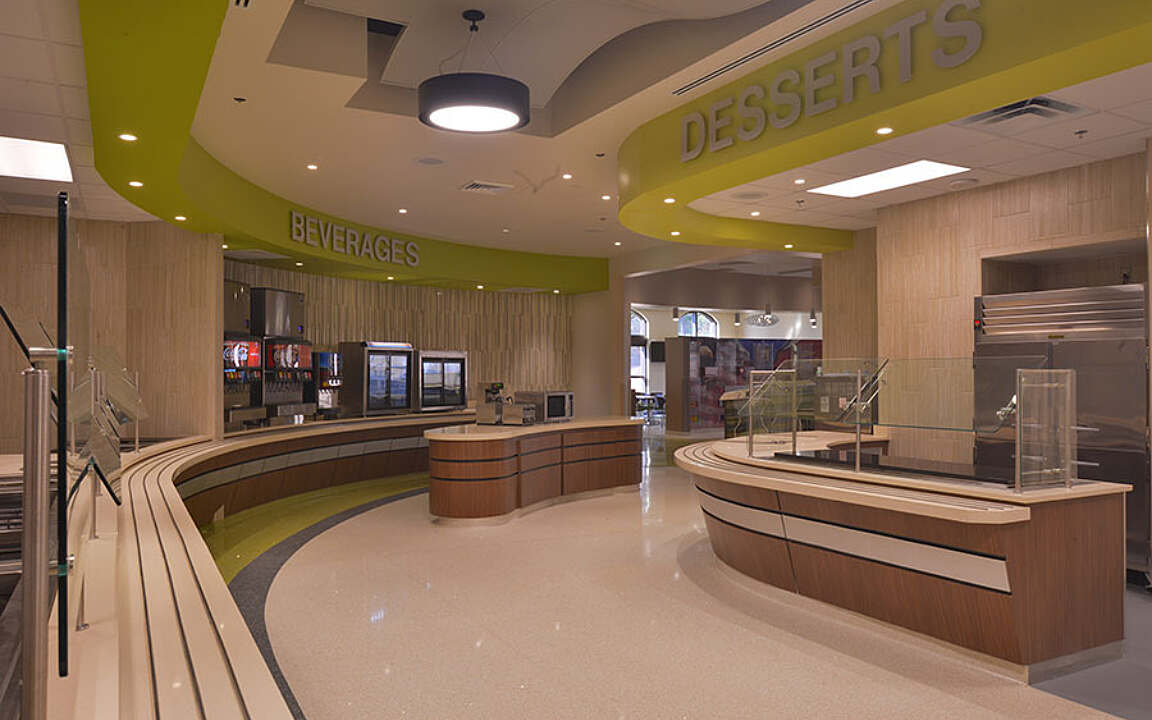 - Serving line design and layout were developed to provide an enhanced and sensory-stimulating food selection experience for patrons of the facility, and avoid a rigid and institutional queuing process in the serving areas.