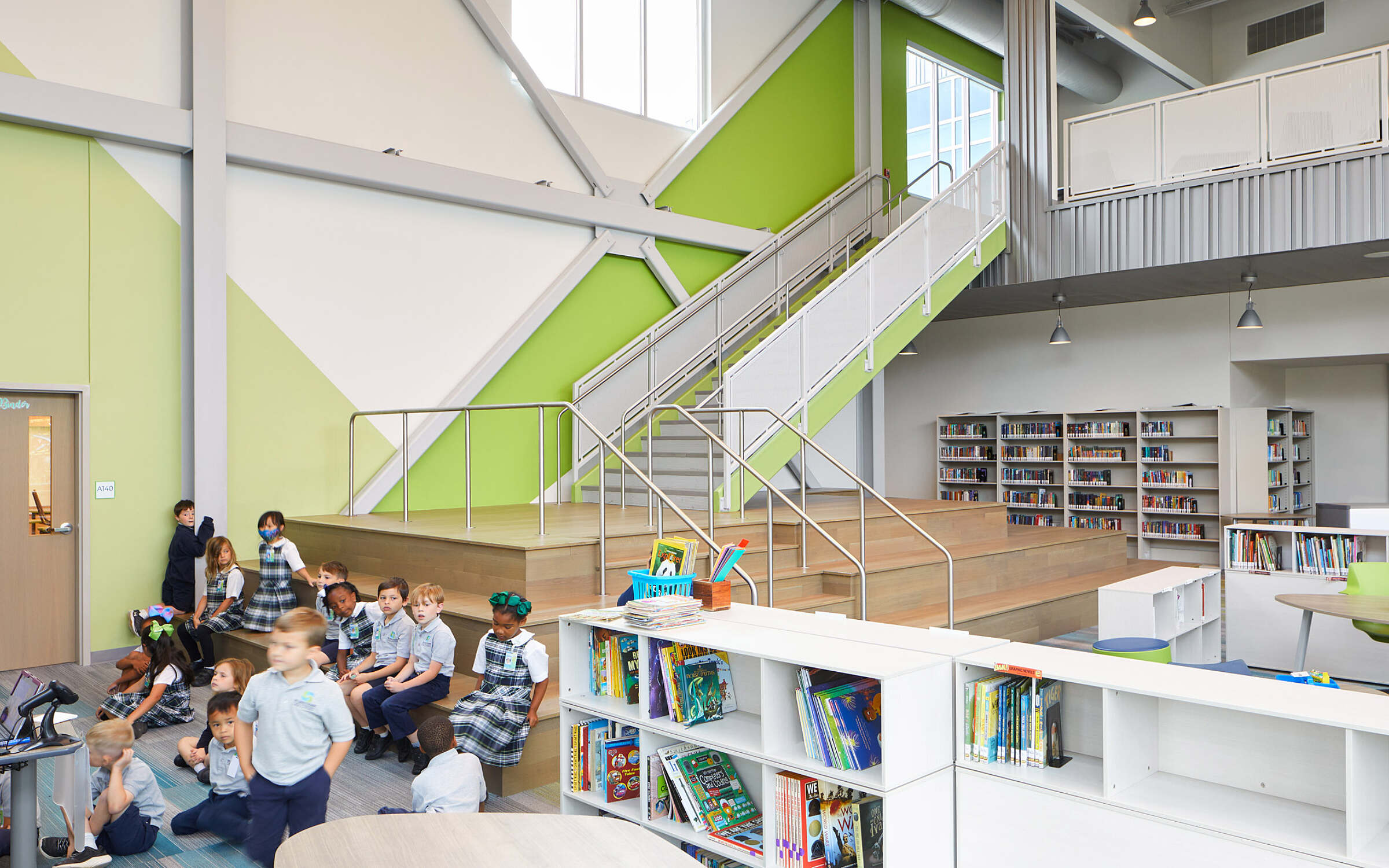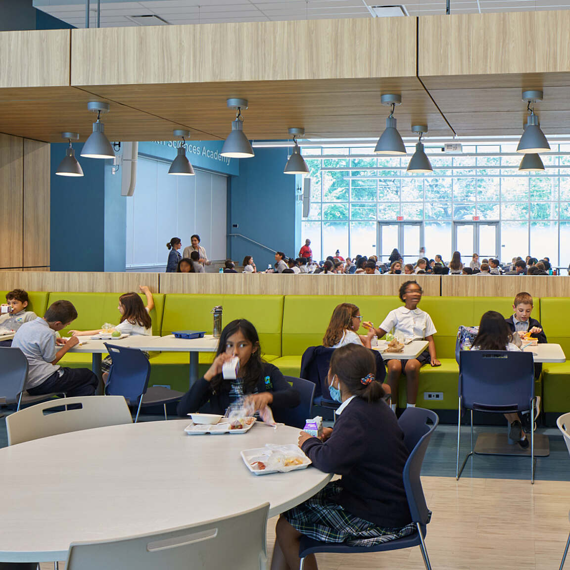 Broad step seating in one of the school’s common areas will allow several grades to come together for shared activities and learning exercises. In addition, an elevated, glass-enclosed science lab at the heart of the school will showcase the hands-on curriculum.