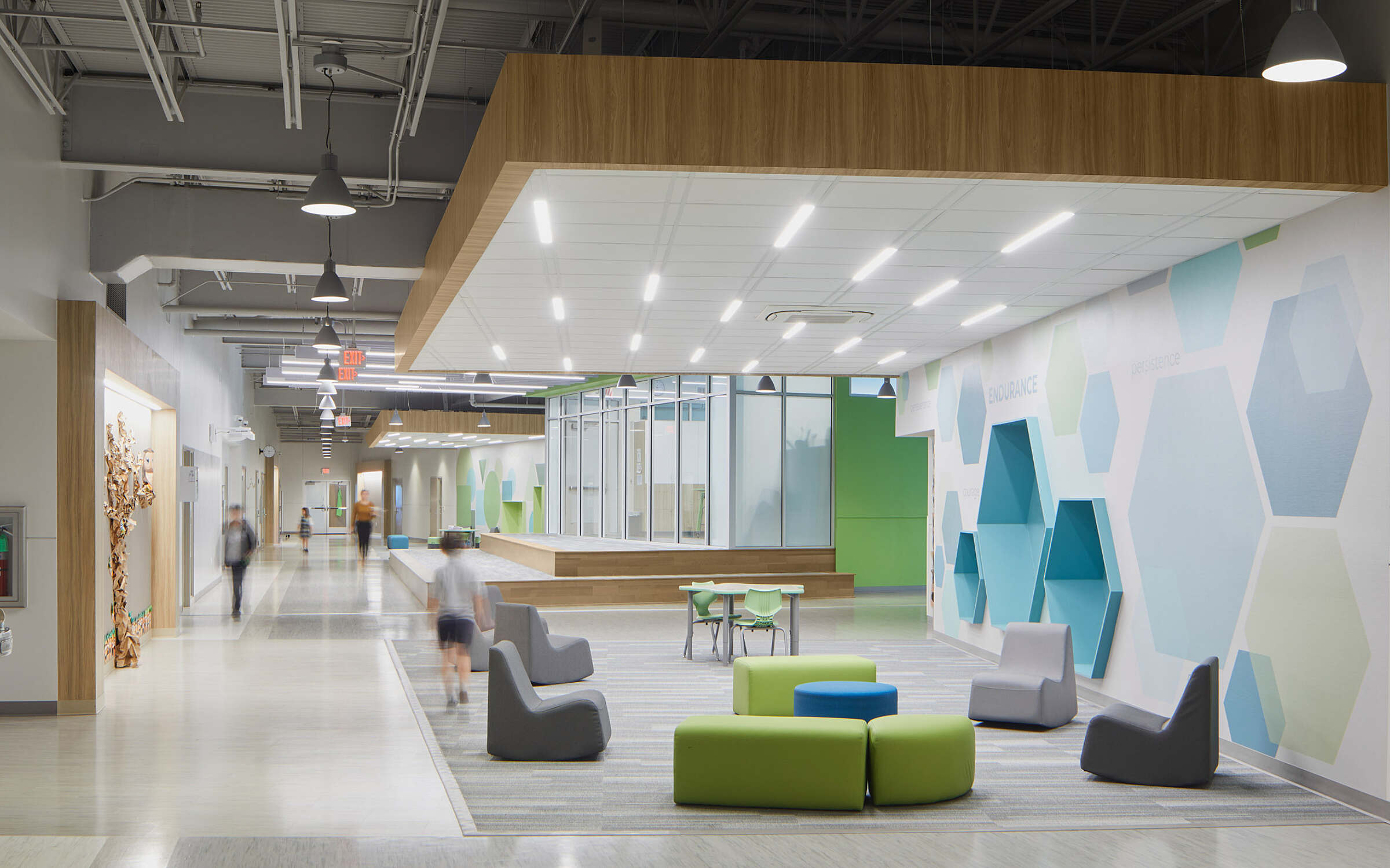 Inside, the school is equally stimulating. Individual learning communities, neighborhoods and collaborative spaces will be identified by large wall graphics and progressively more complex and sophisticated shapes, subtly marking academic progression.