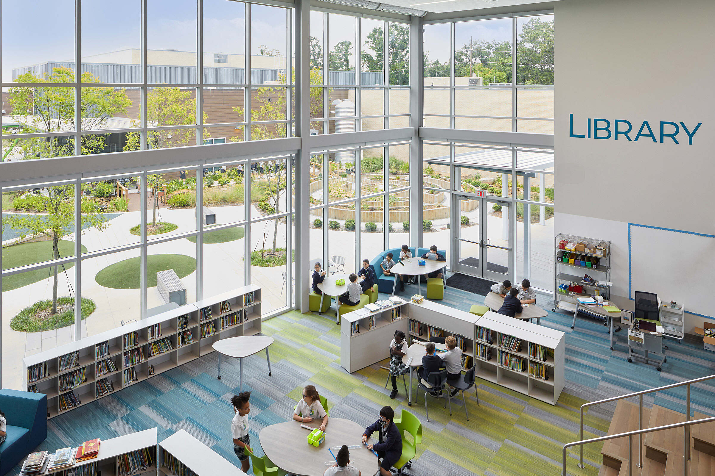 The commons area and media center both open to the courtyard, reinforcing education and healthy living inside and out as well as embracing students’ need for fun and play.