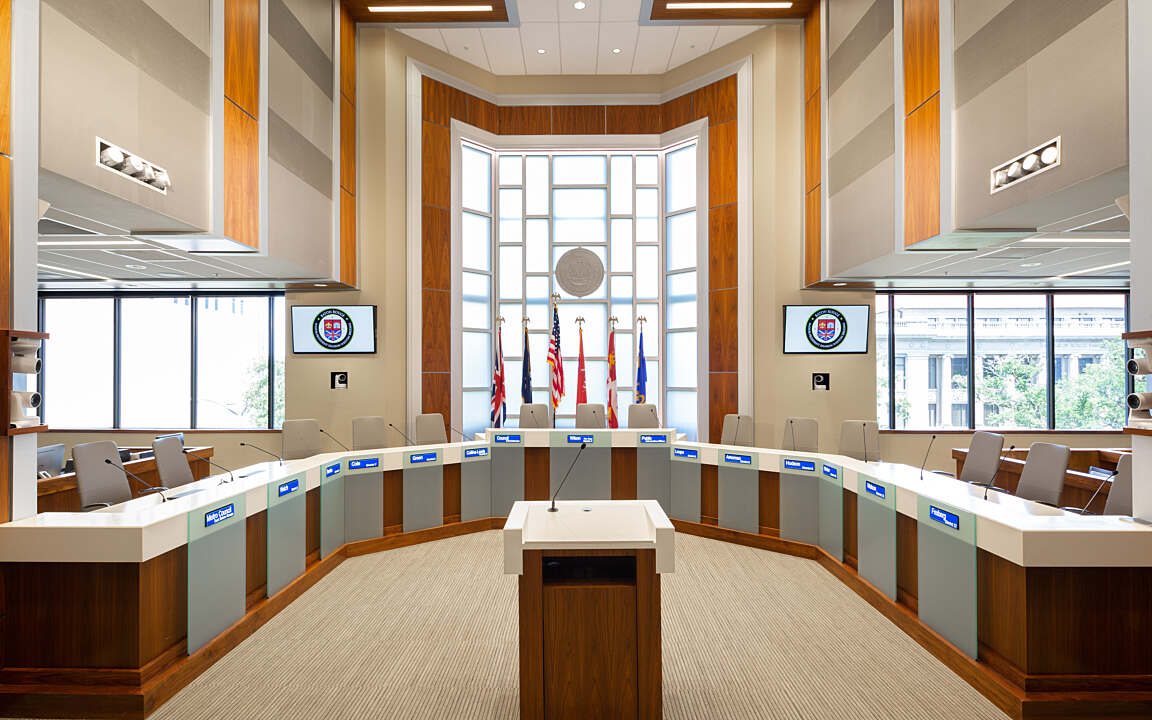 The renovation uses timeless materials to bring the 1970s-era space into the 21st century, creating a sense of stateliness, reverence and modernity. The previous design was dark, heavy and enclosed on account of dense red drapes intended to block light during video recordings. There were also functional challenges with the sound booth, which was located in the middle of the room, and the double-tiered desk placed councilmembers in two rows and made for awkward communication and debate.