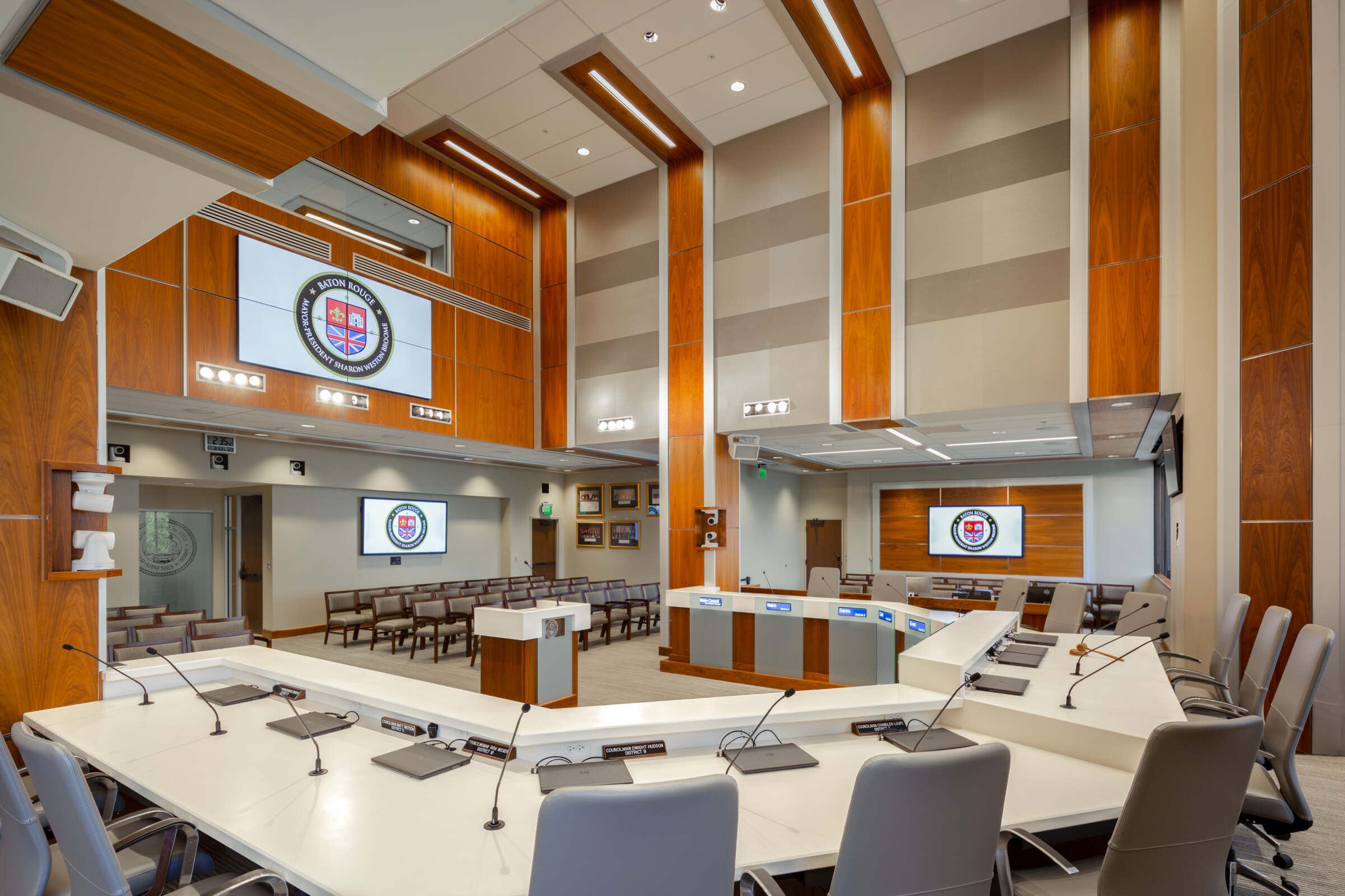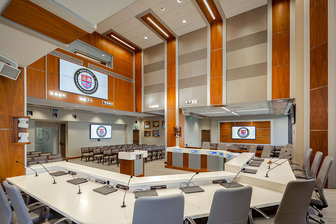 The East Baton Rouge Metropolitan Council Chambers, located in City Hall, underwent a major renovation to improve the flow and operation of council meetings and to better facilitate public observation and participation. The reimagined space provides more public seating, new voting equipment for councilmembers and a state-of-the-art audiovisual system.