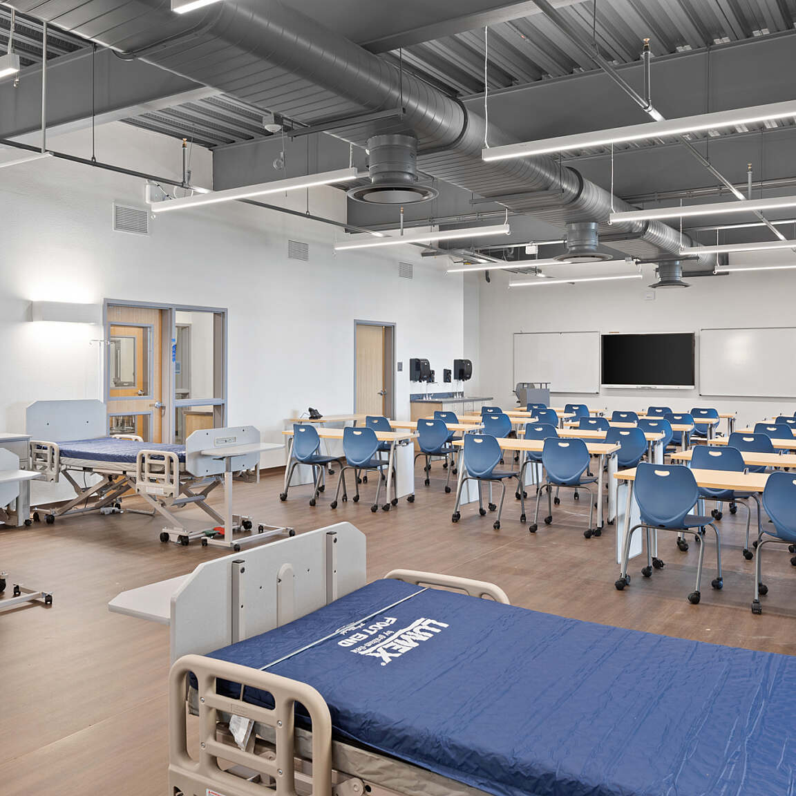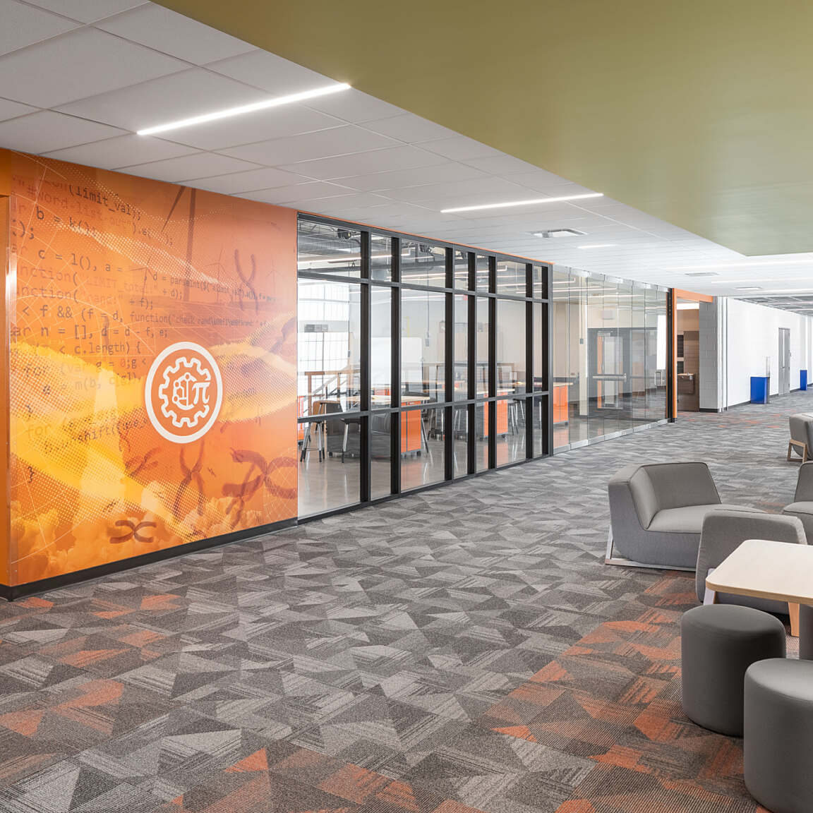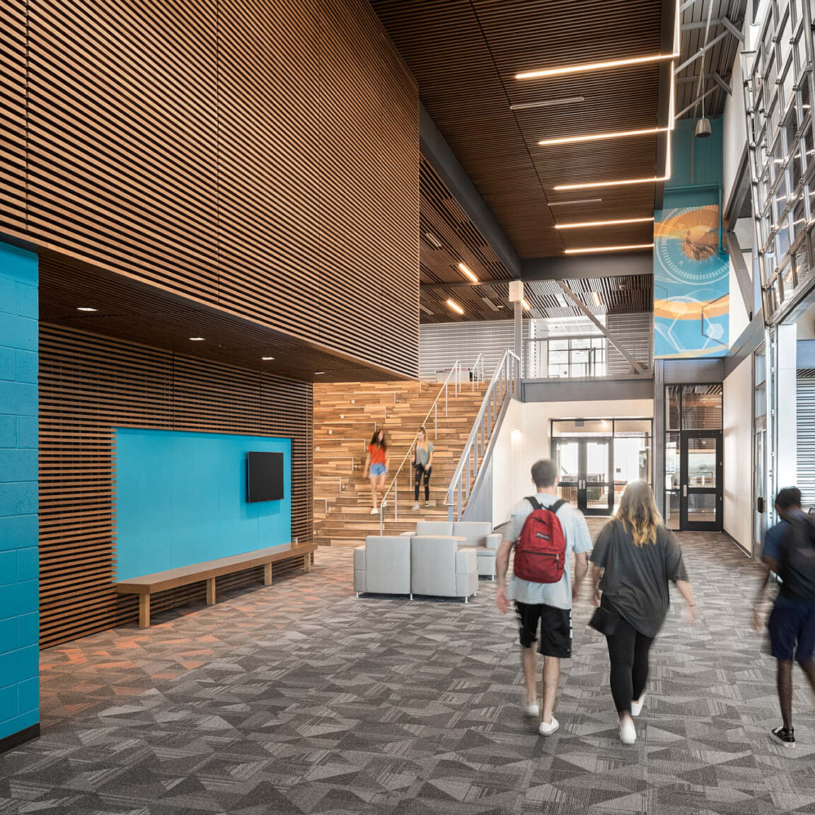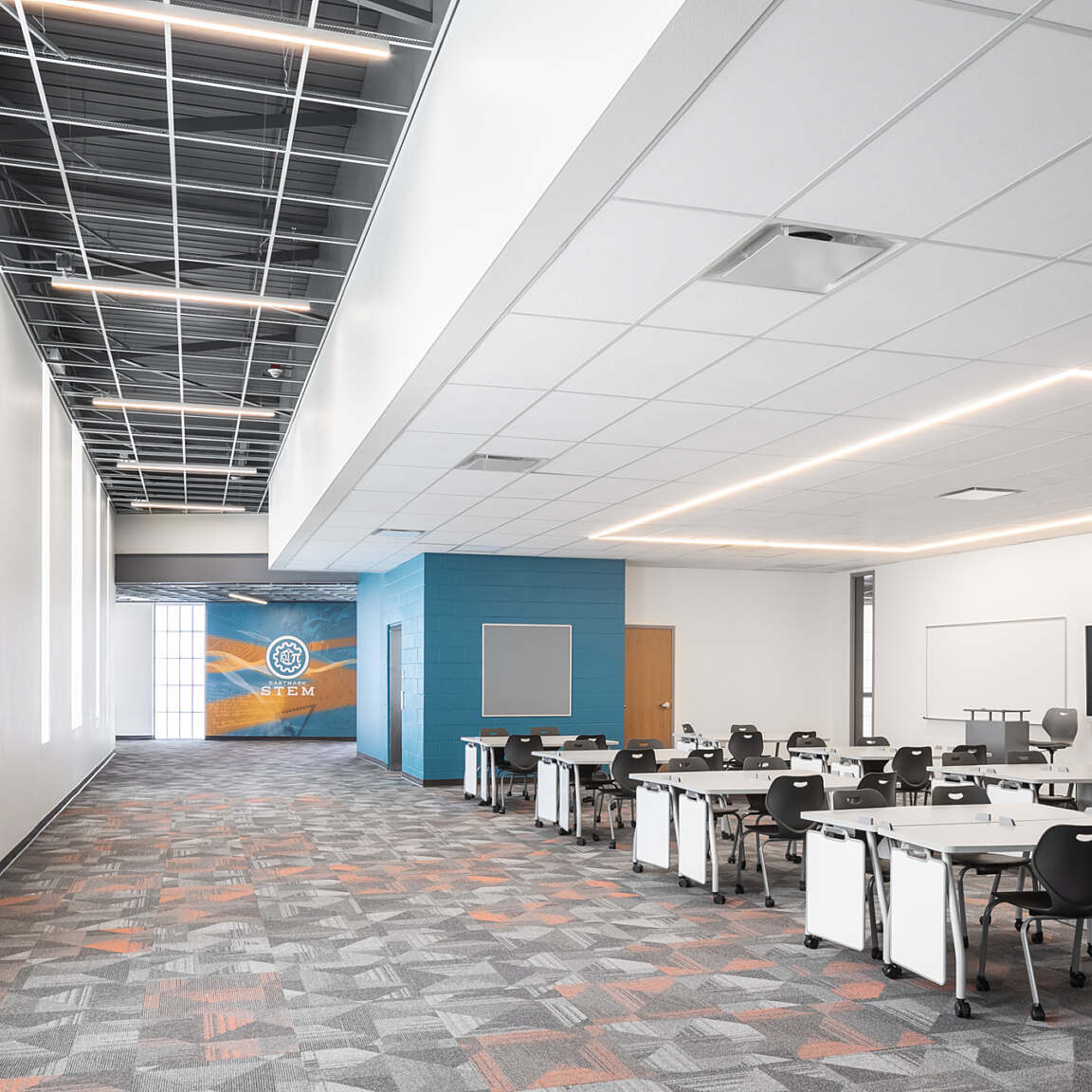 At the heart of the design is the integration of flexible learning spaces and academy-based education. The school features modular learning pods, which allow for adaptable teaching methods and provide students with a dynamic learning experience. Anchored by maker spaces, these pods support hands-on, project-based learning, enabling students to explore subjects in greater depth and collaborate across disciplines. The emphasis on Next Gen learning philosophies allows for an environment that promotes student agency and self-directed learning, helping students develop essential skills for the future.