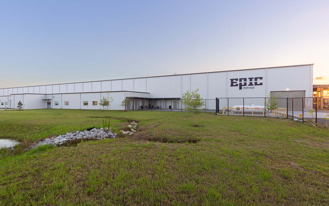 The 268,000 SF Epic Piping production facility sits on a rural 77-acre site and is the first pipe fabrication facility in the state that is fully temperature-controlled. The structure utilizes low-flow air circulation to avoid disruption to welding processes.