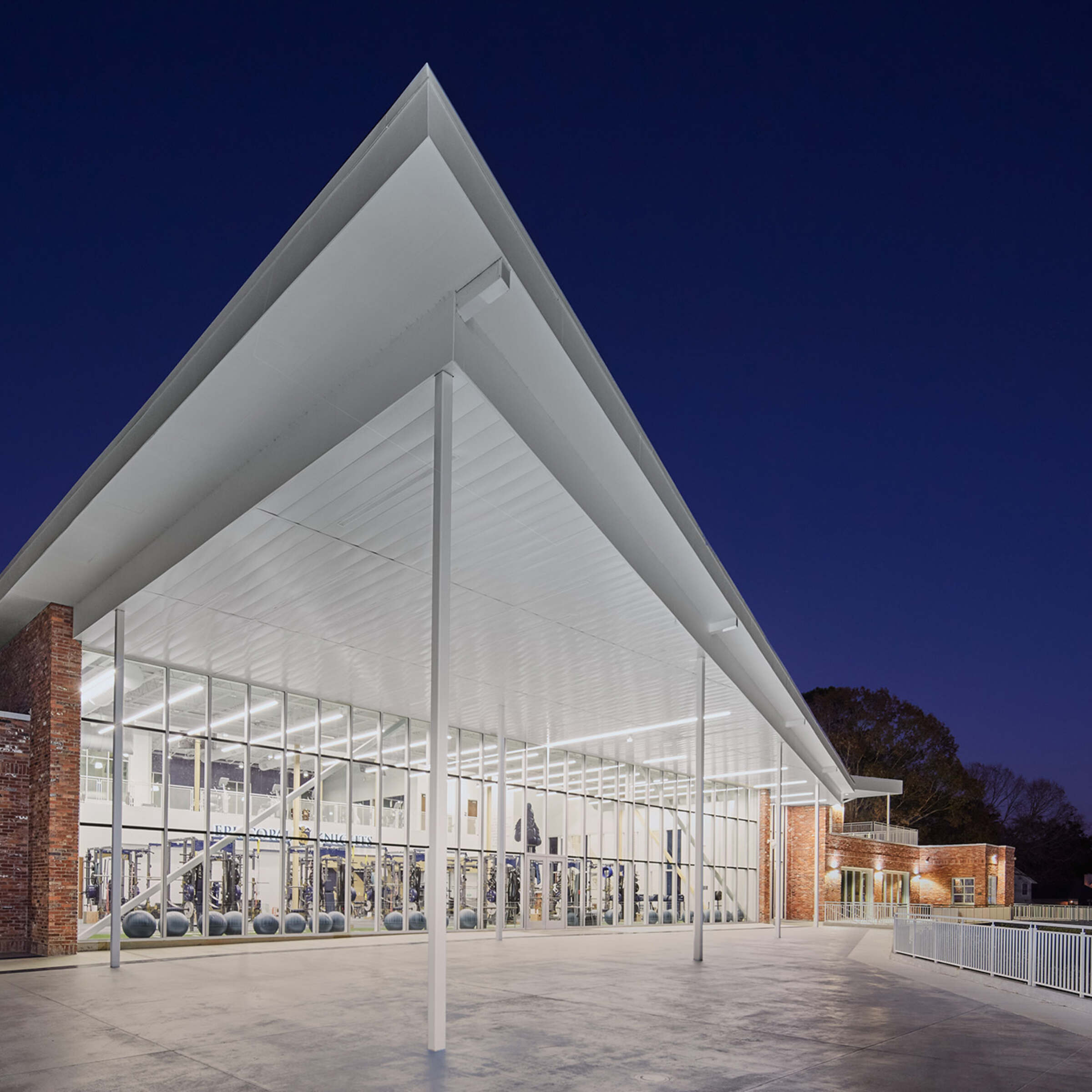 In addition to student functions, the Field House is an ideal venue for alumni events and celebrations. Operable glass walls along the building’s southern façade open out to a terraced plaza, which offers views of the field and campus. The main roof extends along the terrace to provide shading for classrooms, outdoor fitness decks and open-air gatherings.