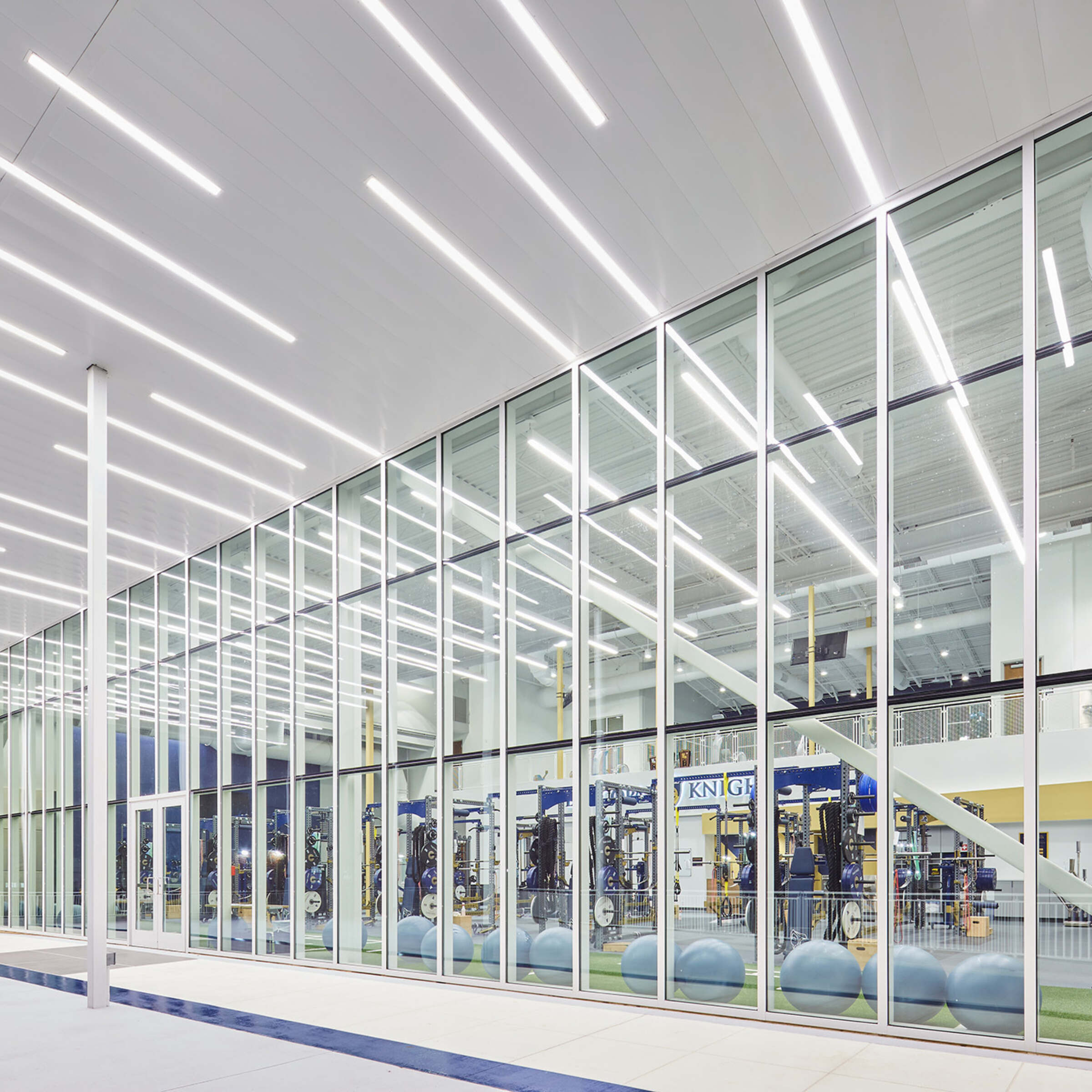 The main two-story volume contains a multi-functional fitness space that includes lifting platforms, cardio machines, medicine ball walls and a turfed agility training area.