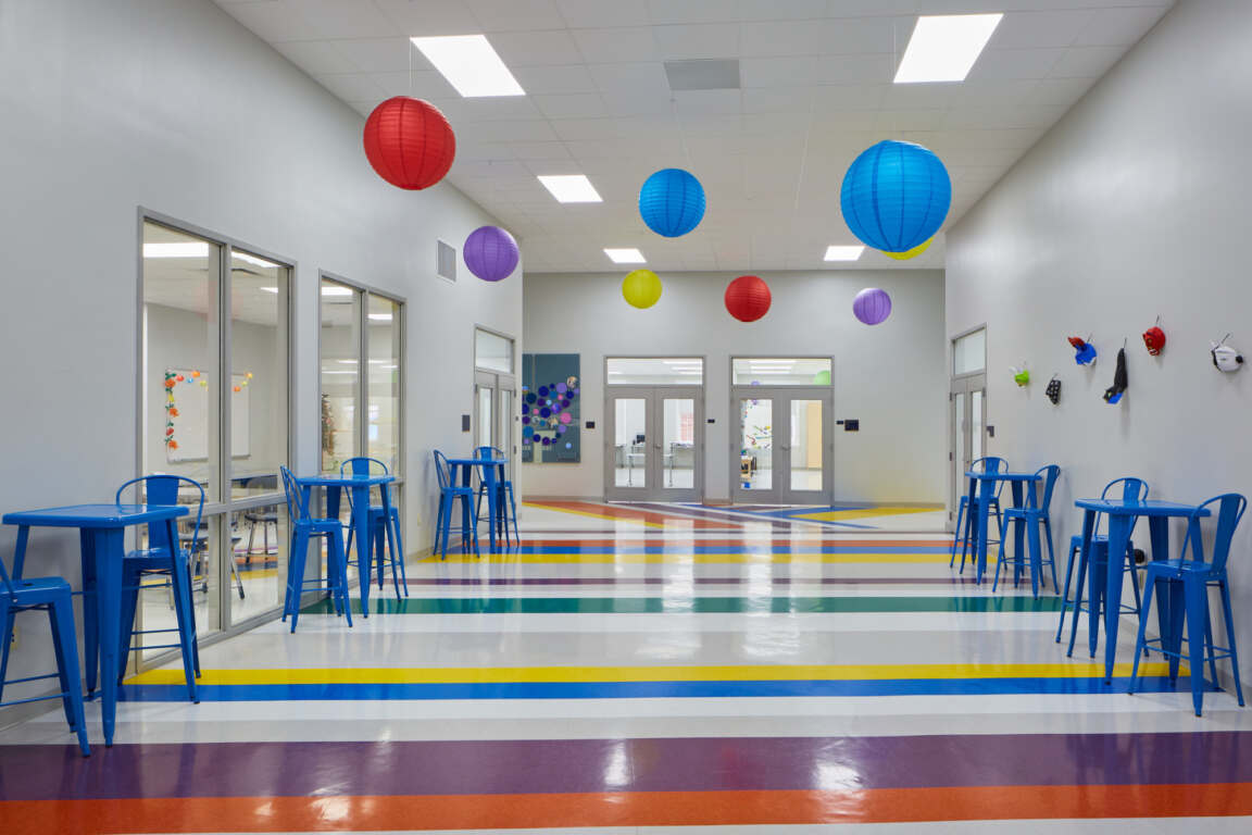 The multi-use facility supports physical education classes for students of all ages as well as strength training for interscholastic sports.