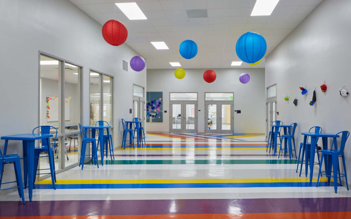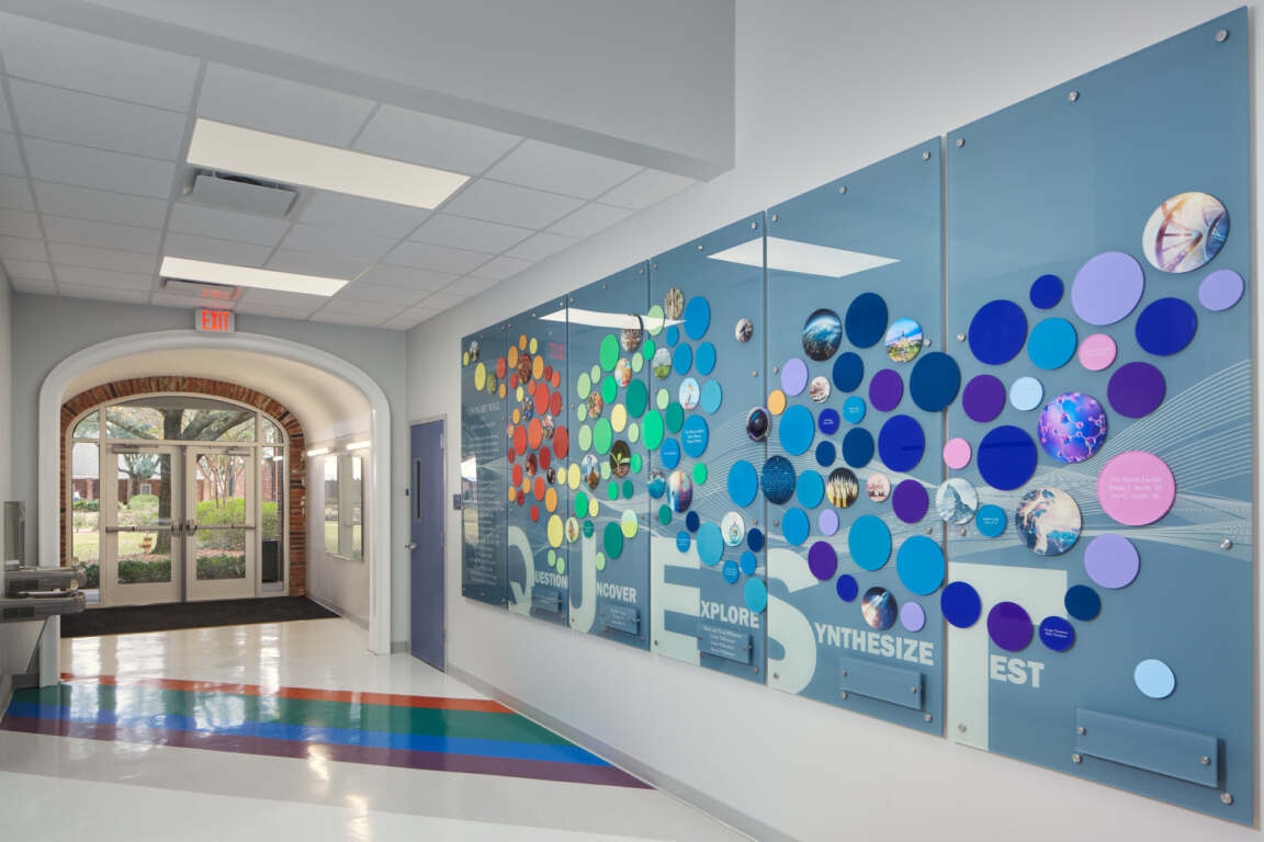 The Quest Center in Foster Hall was a complete interior renovation geared to the Lower and Middle Grade students of Episcopal. QUEST, which stands for Question, Uncover, Explore, Synthesize, Test was designed to facilitate project-based learning to foster innovation and experimentation. The building was completely transformed to accommodate a Learning lab, Design Studios, Digital Media Lab, Investigation Studio, Chemistry Kitchen, large Breakout and Flex spaces and given new finishes, electrical fixtures, and technology. Wall finishes were kept mostly neutral to allow the students’ projects to shine when on display. Color and vibrancy are offered through an angular, striped floor pattern and in the furniture.