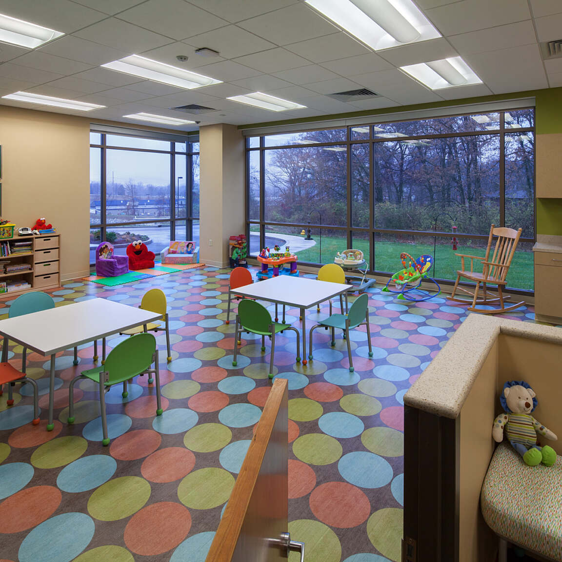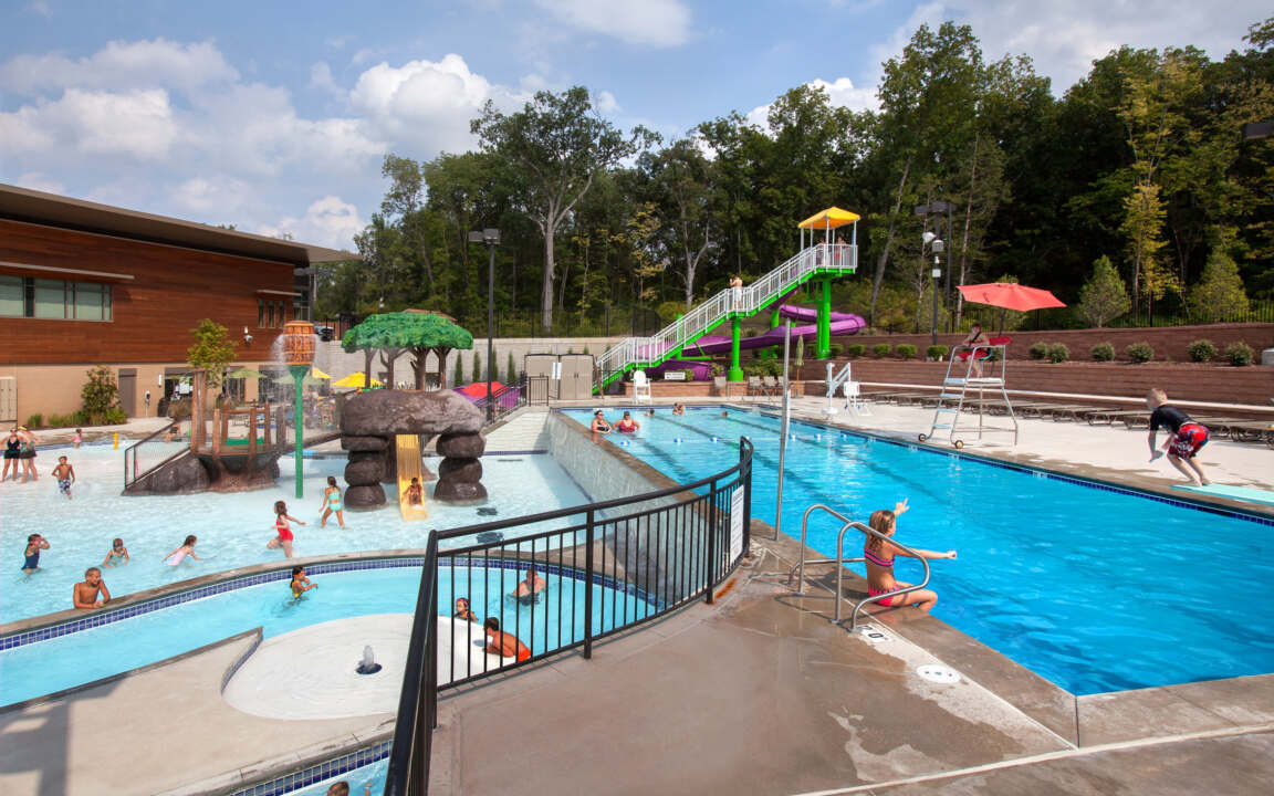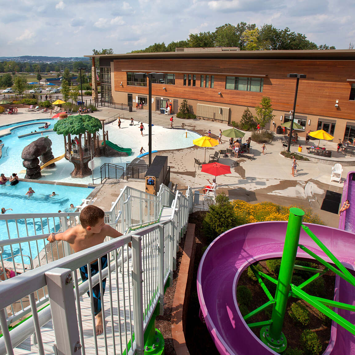 The aquatic area includes a lower pool, an upper pool, and a two-story slide designed for all age groups. The zero-entry lower pool features a tot area, play structure, slide, and lazy river, while the upper pool offers three lap lanes and a 1-meter diving board. A cascading waterfall connects the pools, enhancing both function and aesthetics. A wet party room adjacent to the pool deck provides easy access for special events.