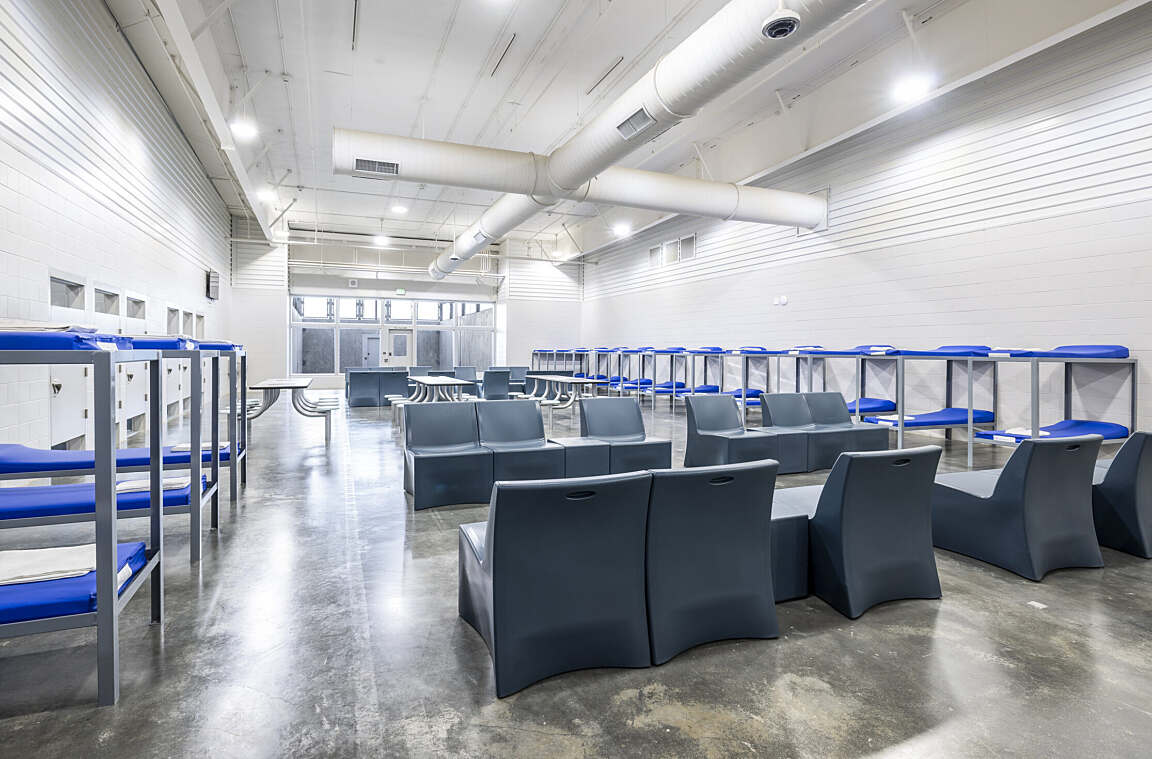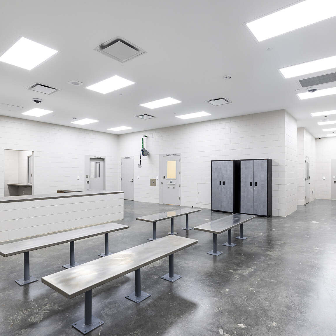 In addition to dormitory housing, the facility contains 18 segregation cells for at-risk inmates, ensuring appropriate accommodations for varying security needs. Special consideration was given to diverse inmate populations through the inclusion of a dedicated female dormitory and three juvenile holding cells, each with private entrances to meet legal requirements and safeguard young offenders. A state-of-the-art medical suite further supports inmate health and wellness.