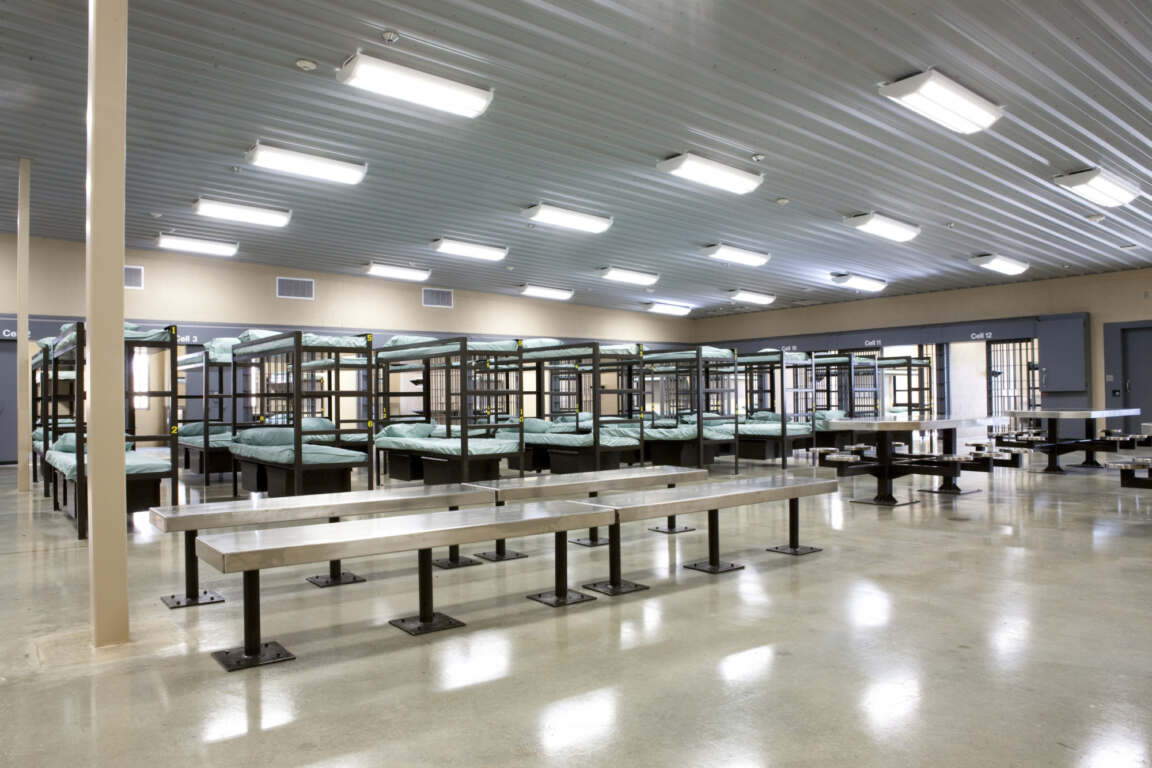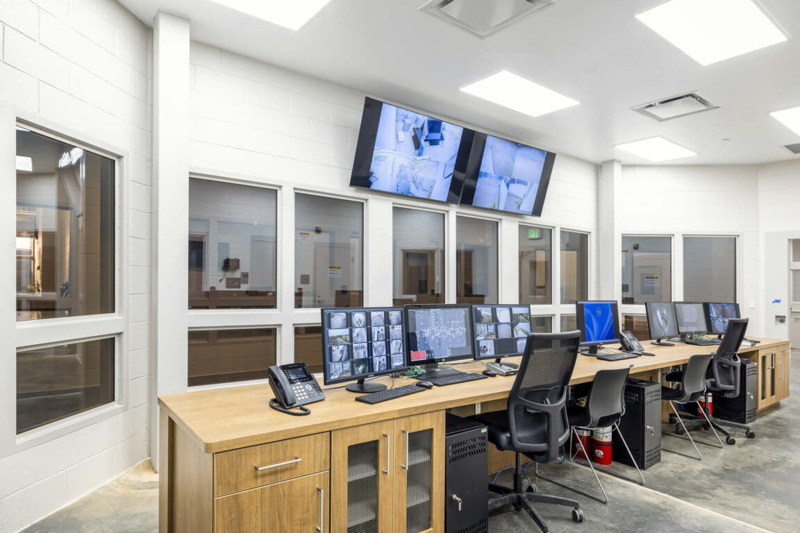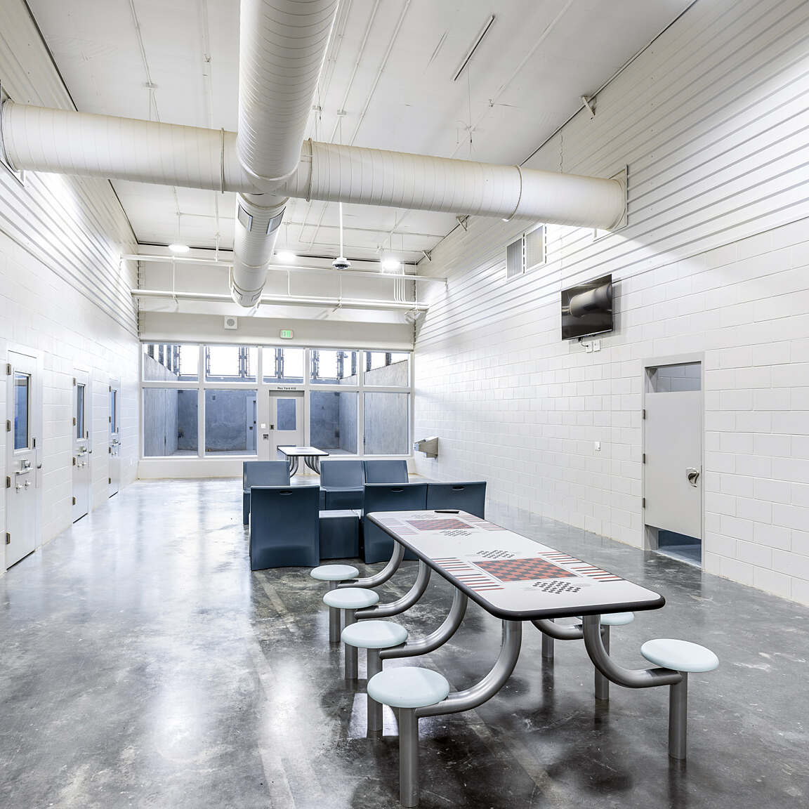 Each dormitory is thoughtfully designed to maximize natural light and includes adjacent recreational yards with direct access to a multipurpose room used for chapel services and educational programs. A centrally located control room allows for direct supervision of the majority of housing units, reinforcing safety, visibility, and effective management throughout the facility. Supporting amenities include a fully operational kitchen, laundry facilities, an intake and booking area, a modernized public lobby, and dedicated medical and administrative offices.