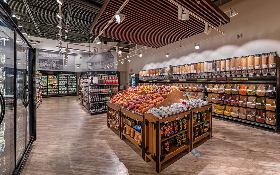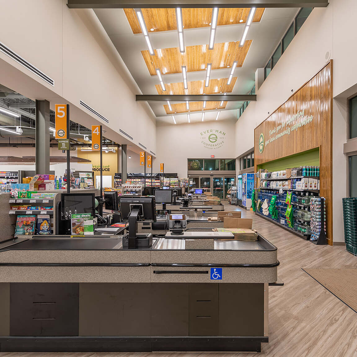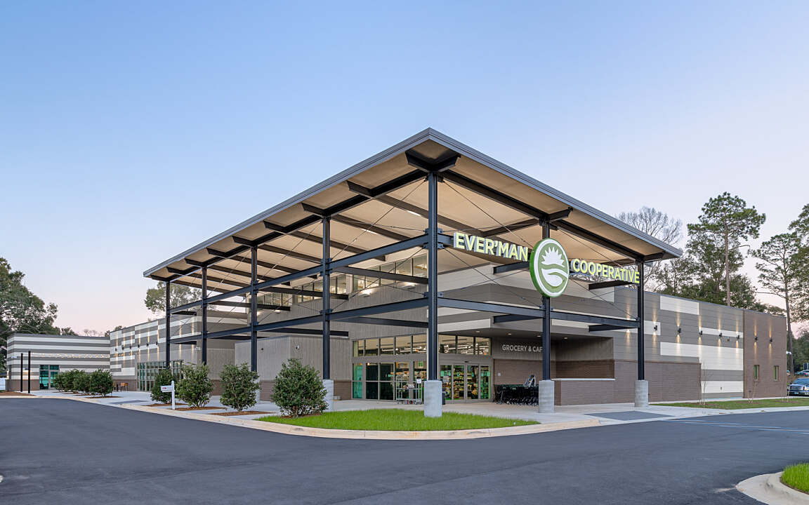 Ever’man Cooperative Grocery & Cafe prioritizes accessibility for all, embodying the brand’s unwavering commitment to providing a diverse community with access to organic, nutritious foods. The store's layout is meticulously crafted, featuring product placements and displays that cater to convenience and create an inviting atmosphere for shoppers. The double height entry-way and strategically placed skylights flood the sales floor with natural light. The dining area, complete with globe light fixtures and a fireplace, adds a warm and contemporary atmosphere, while offering a diverse menu to customers. Ever’man Grocery remains dedicated to fostering inclusivity, ensuring that everyone can enjoy the benefits of wholesome and sustainable food options.