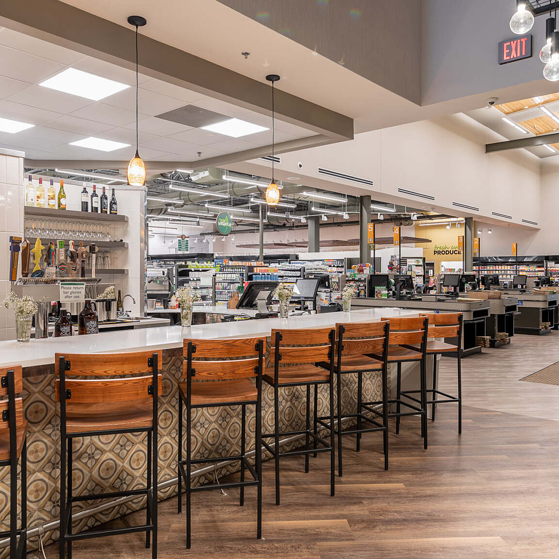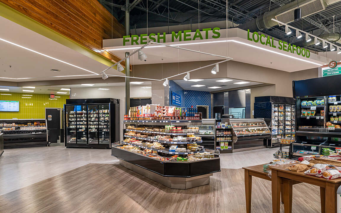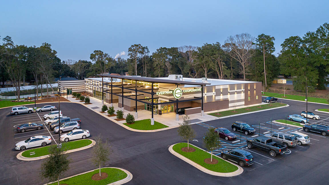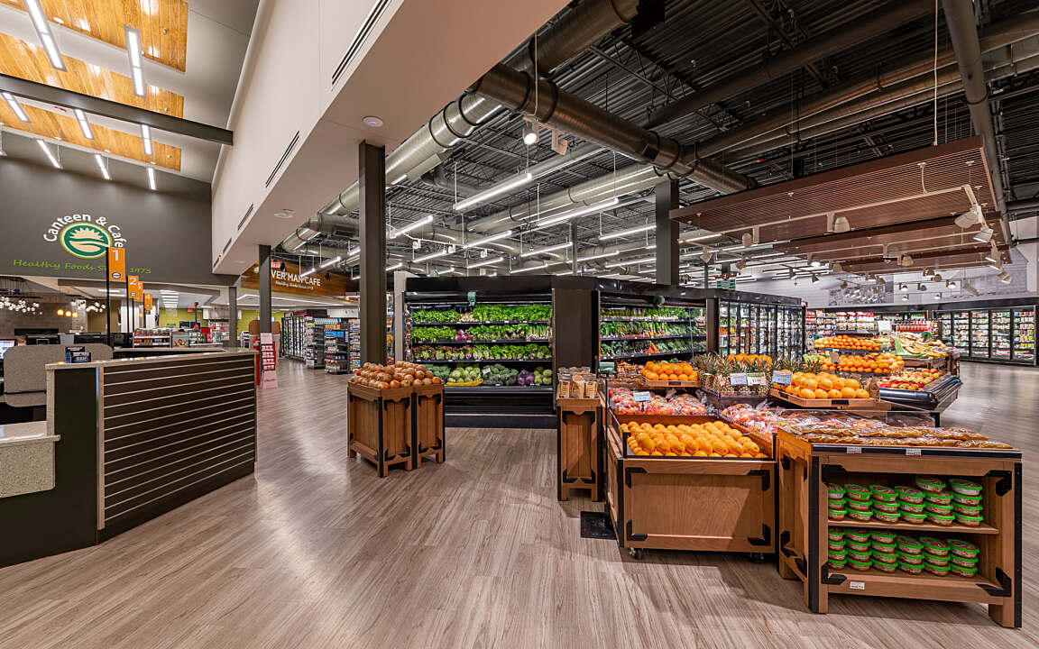 Ever’man Cooperative Grocery & Cafe prioritizes accessibility for all, embodying the brand’s unwavering commitment to providing a diverse community with access to organic, nutritious foods. The store's layout is meticulously crafted, featuring product placements and displays that cater to convenience and create an inviting atmosphere for shoppers. The double height entry-way and strategically placed skylights flood the sales floor with natural light. The dining area, complete with globe light fixtures and a fireplace, adds a warm and contemporary atmosphere, while offering a diverse menu to customers. Ever’man Grocery remains dedicated to fostering inclusivity, ensuring that everyone can enjoy the benefits of wholesome and sustainable food options.
