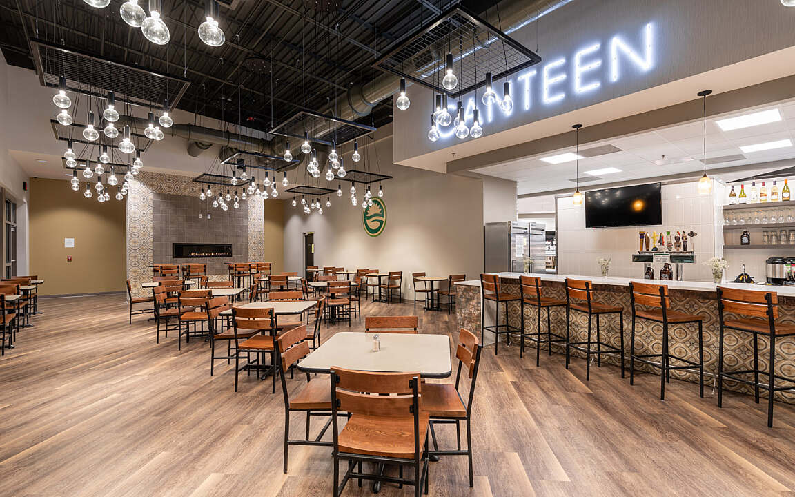 The spacious outdoor dining patio, complete with a fire pit and a scenic walking trail, encourages both customers and the community to embrace an active lifestyle.