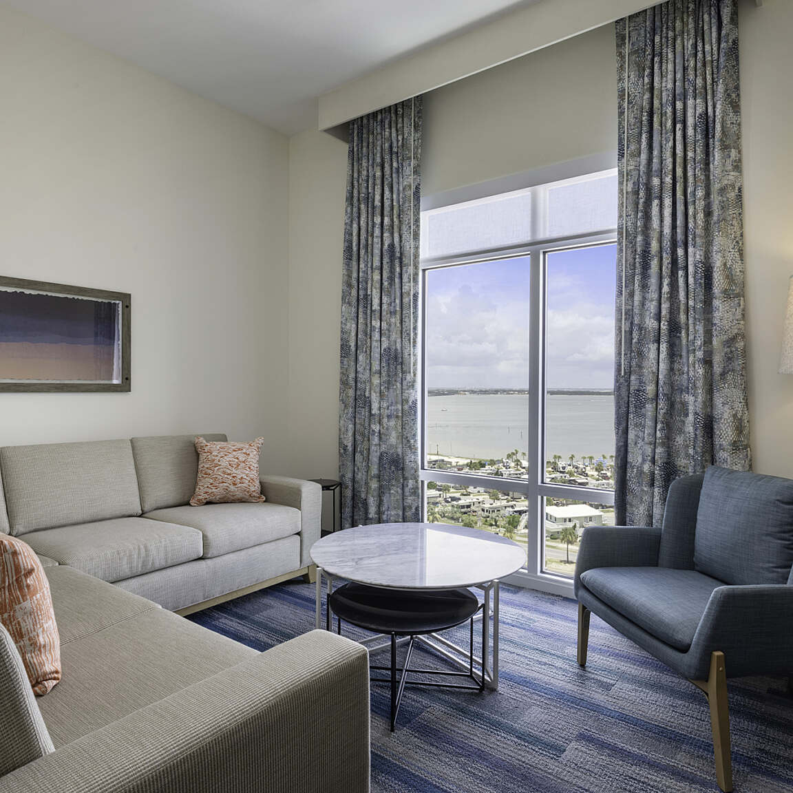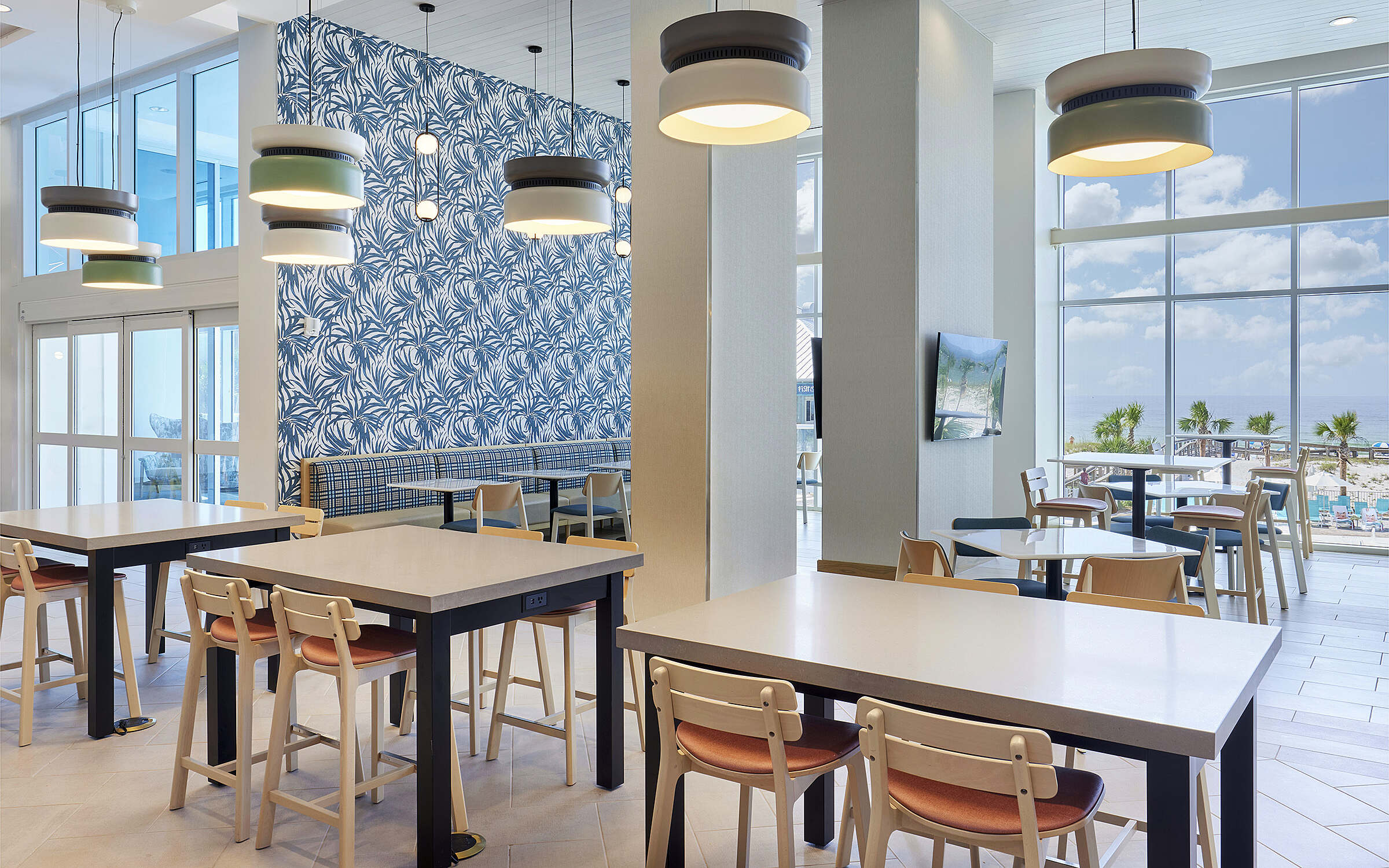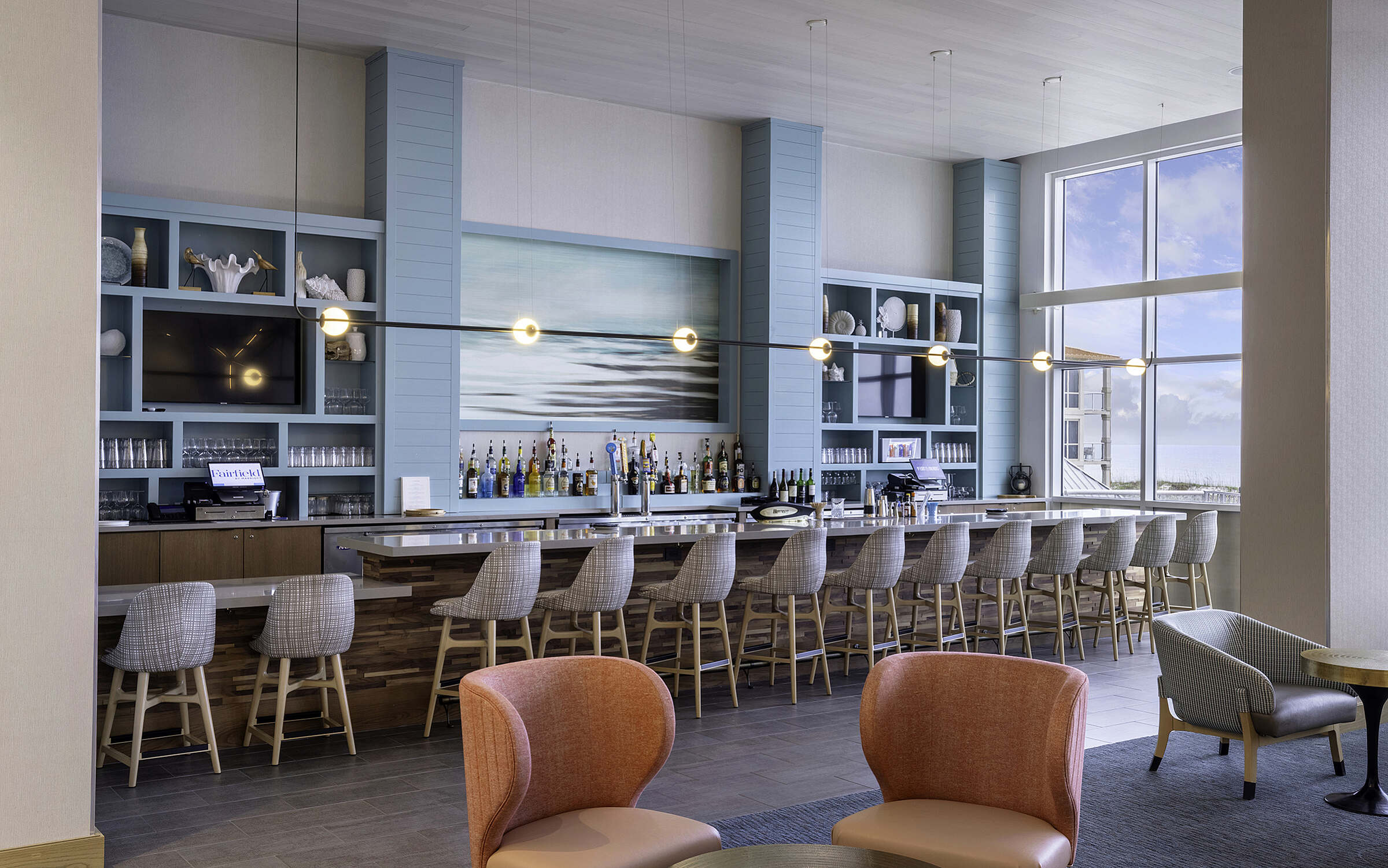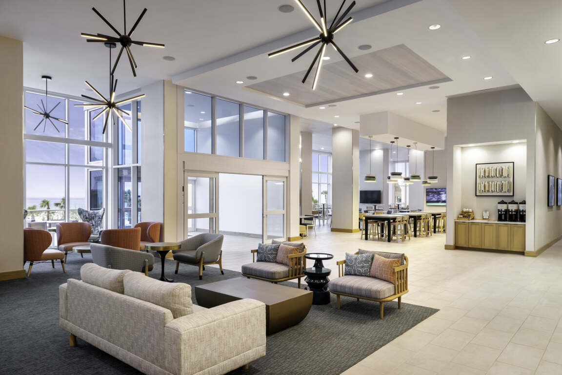 Blending high-end aesthetics with soothing décor, the lobby warmly welcomes guests with its inviting atmosphere and expansive views of the beach.