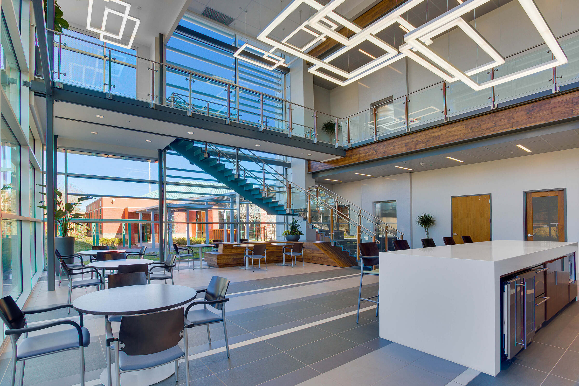 Bright, crisp interior spaces, including the flexible conference center/meeting room, are warmed by natural wood and a variety of innovative lighting designs. The wealth of natural light can easily be mitigated for presentations via motorized blackout shades.