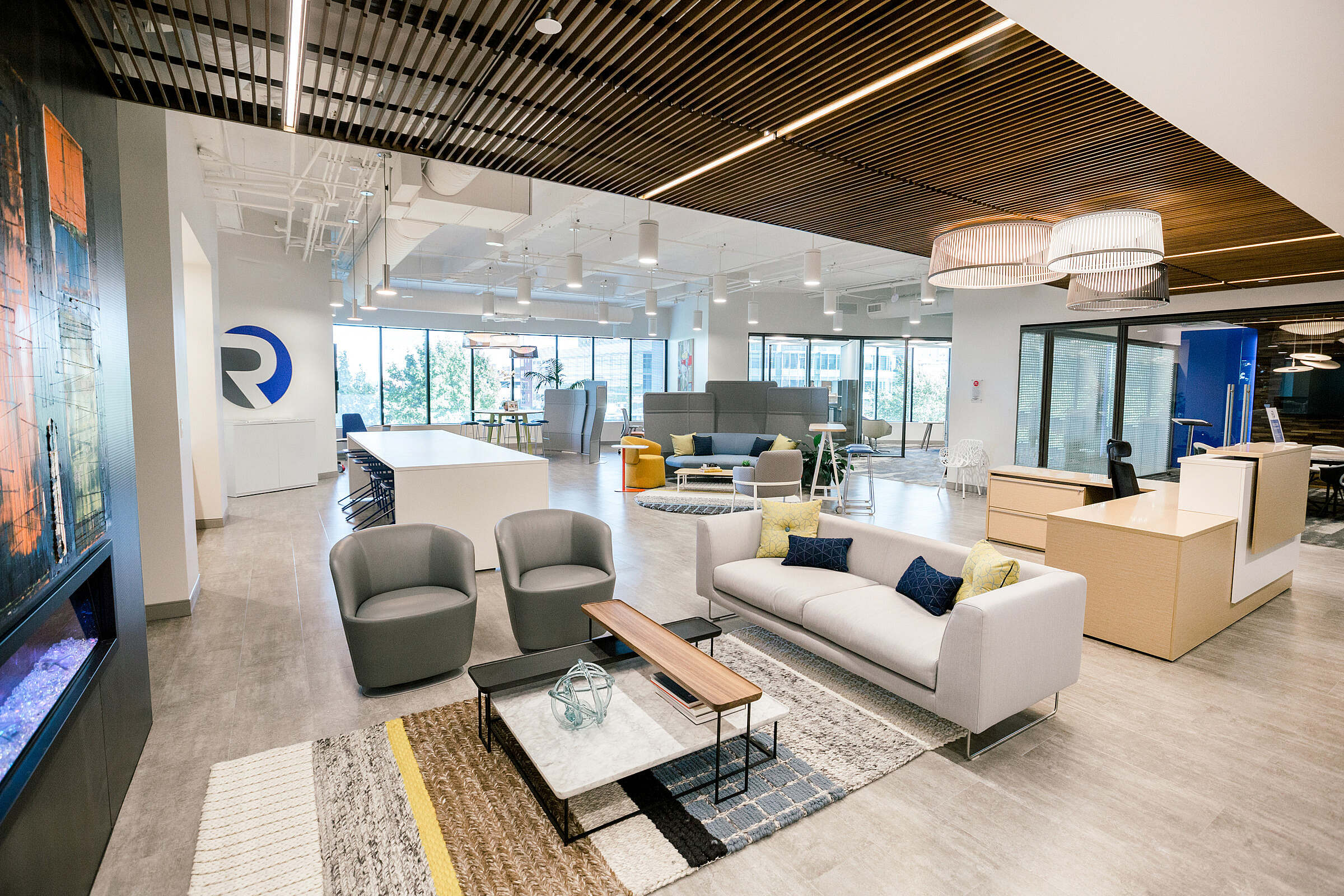 Additionally, comfortable and inviting high-performance furnishings and fabrics reflect the down-to-earth nature of the organization. Lighting elements, color and wood wall accents in public spaces and confluence points double as subconscious wayfinding tools.