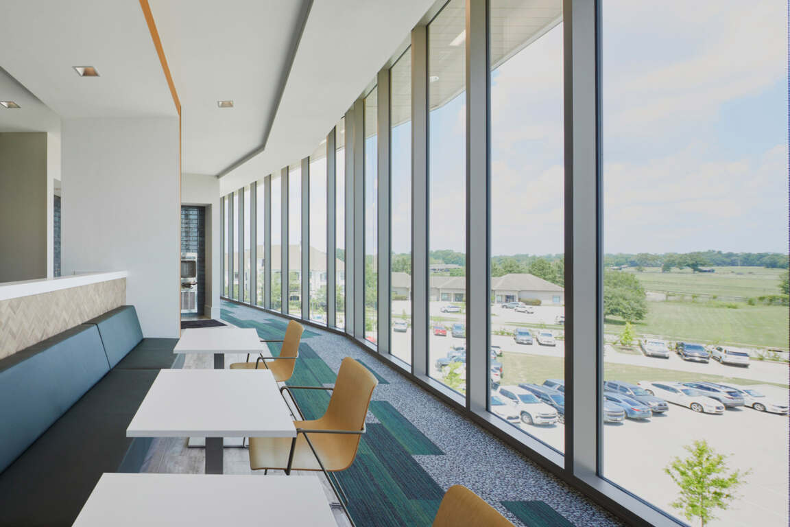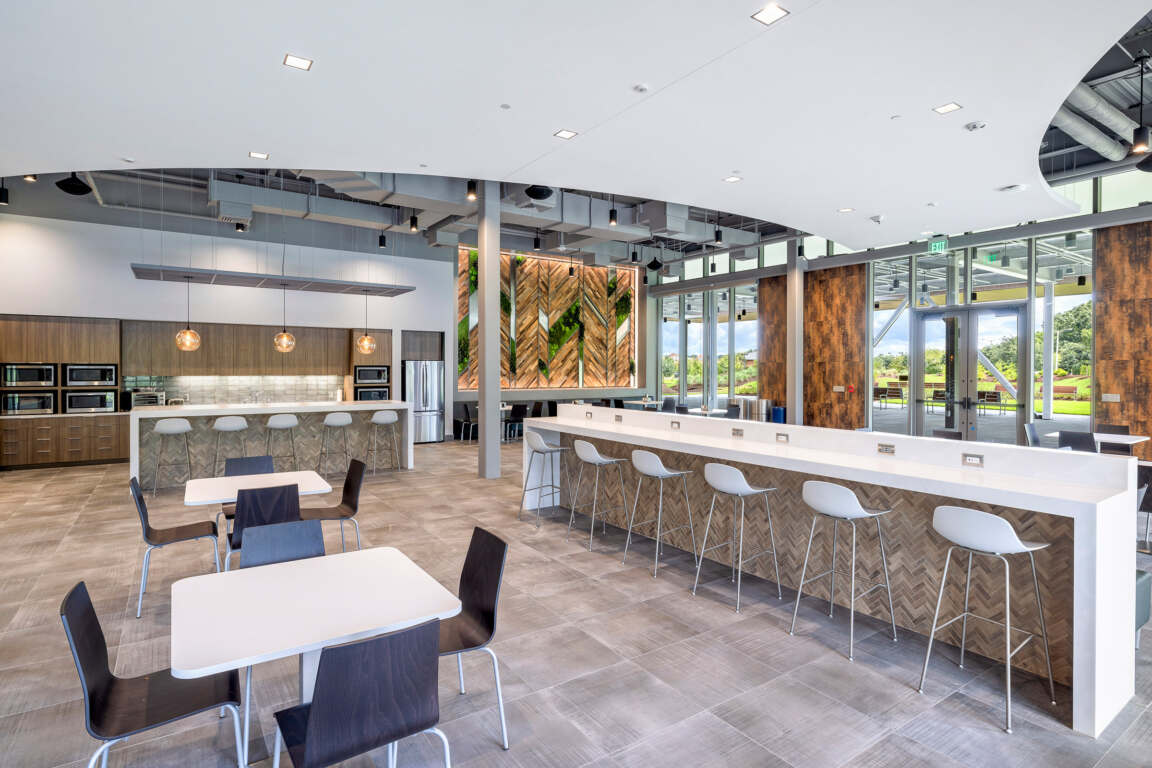 Health and balance are quietly communicated through all work and social spaces within the Louisiana Farm Bureau Corporate Headquarters building. For example, designers eschewed the traditional uninspired break room aesthetic to create a comfortable, inviting wellness-driven space where employees can relax or collaborate.