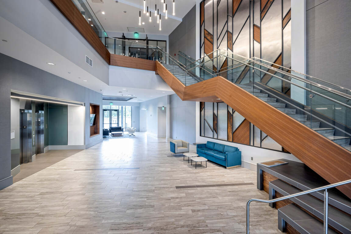 In addition to creating an organic and timeless aesthetic (reducing the need for future interior renovations as trends shift), the low-maintenance textures and finishes are designed to withstand high-traffic, commercial wear.