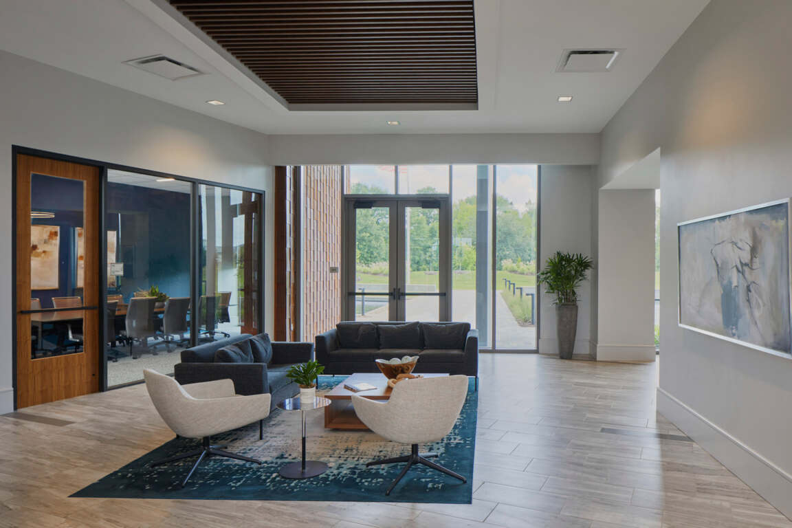 The project team expertly integrated examples of biophilic design throughout the interior materials and finishes. These include genuine wood accents; carpet and wall textures that mimic river rocks and petrified wood; and conference rooms named for trees that are indigenous to Louisiana. To complement these high-end, hospitality-inspired finishes, the design team integrated Corten products into both interior and exterior spaces, increasing the sense of cohesion and flow.