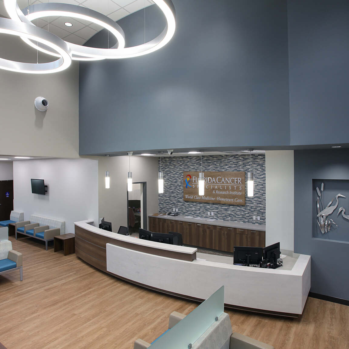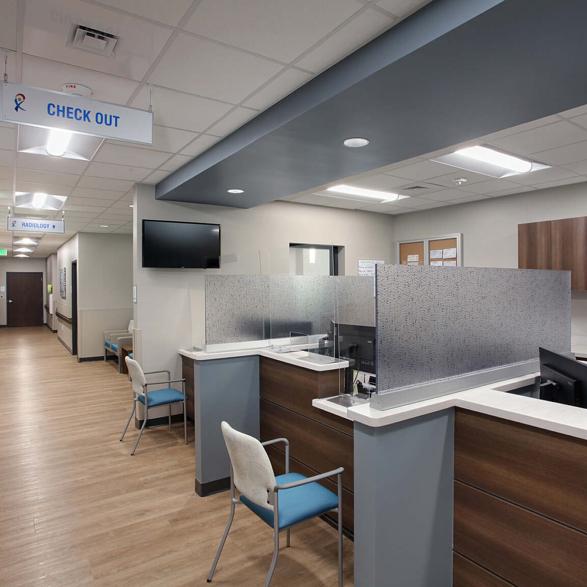 In the lobby, the design team selected durable wood-look LVT flooring (with added cushioning for patient comfort) and a calming blue-gray color palette. Large windows throughout the building keep the interior bright, and decorative light fixtures enhance the welcoming atmosphere in the lobby.