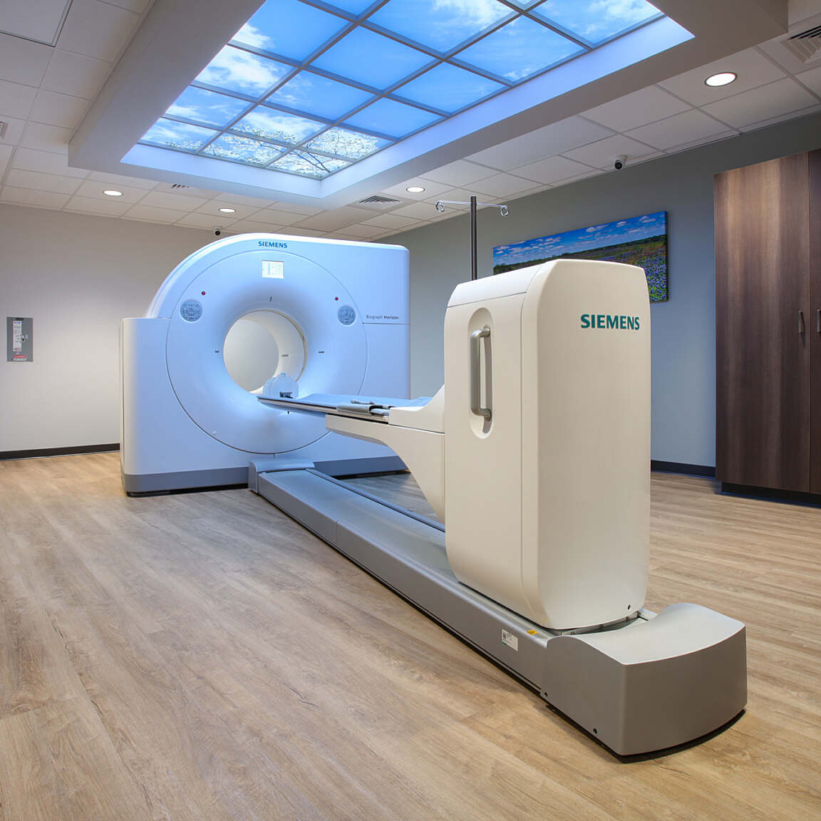 Developing the imaging and PET/CT area required close collaboration with equipment vendor Siemens and a radiation physicist. As the PET/CT equipment is large, heavy, and features delicate technology and components, the design team carefully planned a delivery route through the building to accommodate installation as well as future removal and replacement. This involved ensuring ample door and hallway widths and turning radii, which also contribute to the building’s spacious feel. The PET/CT area includes a Sky Factory ceiling, which mimics a skylight by displaying a digital image of trees and sky to help patients feel more at ease.