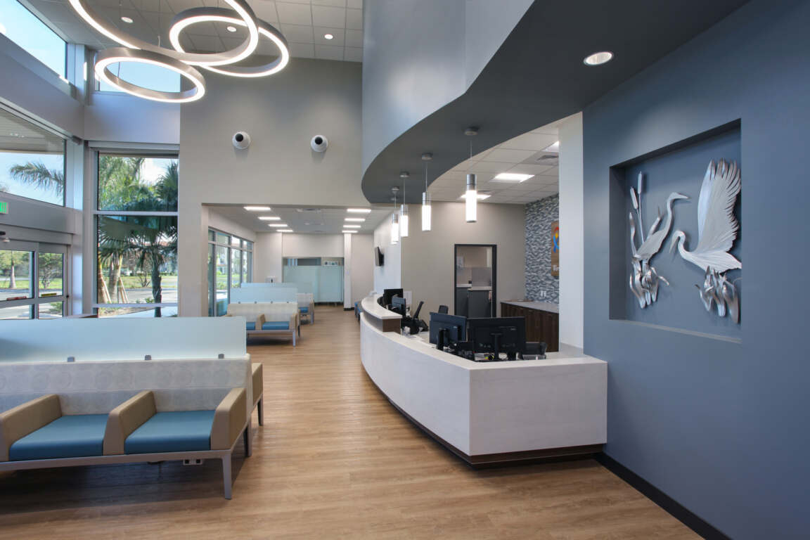 In keeping with FCS’s signature style, patients are greeted by a two-story-volume stone entryway and waiting area, which also serves as the building’s focal point. The space features a variety of patient seating and a reception area.