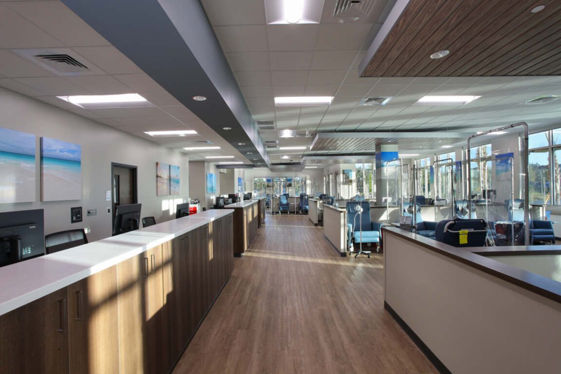 Estero Cancer Center features three primary areas: imaging with PET/CT, a clinic with exam rooms, and a 38-chair infusion room. All spaces incorporate durable, long-lasting, easy-to-clean, medical-grade materials and finishes, including low-VOC paints, while still providing a comfortable and healing setting.