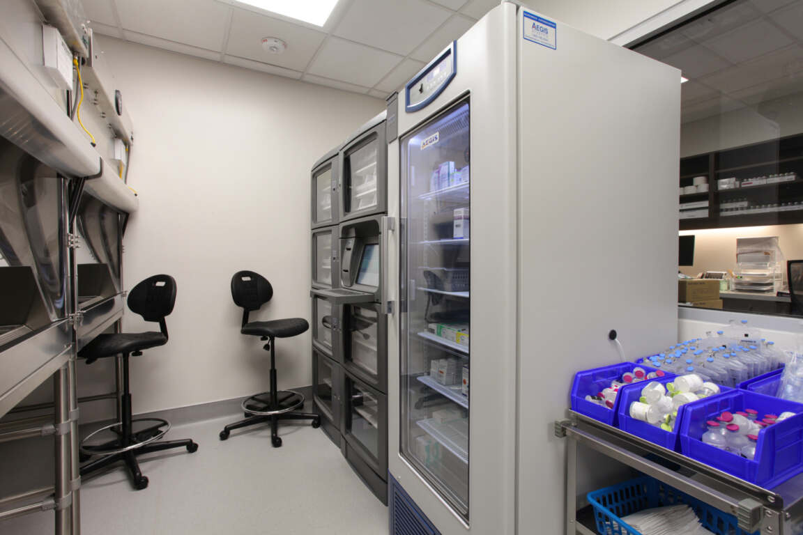 The pharmacy design meets USP-800 clean room requirements and maximizes workflow while allowing direct access to the nurses’ station. The negative-compounding room, where providers prepare chemotherapy treatments, meets strict ventilation and infection-control guidelines through specialized floor, wall and ceiling treatments. The Pharmacy is protected with access control technology and security cameras to protect patients.