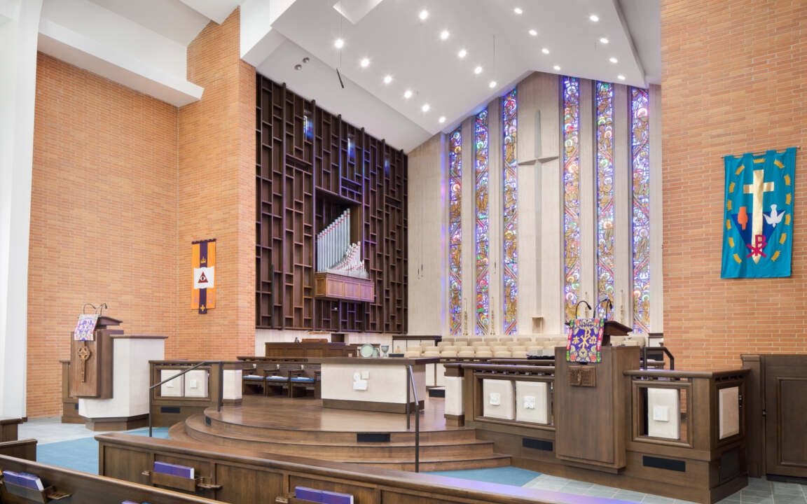 Our firm was hired by the church to study ways to improve and renovate the existing sanctuary built in the 1950s. We studied several ways to reconfigure the chancel area and to make it accessible to people with disabilities. The result is an enlarged chancel area with a wheelchair lift for access. The choir risers were relocated and rebuilt to face the choir toward the congregation to allow for better projection of their voices. All finishes were restored throughout the sanctuary including reupholstering the pews. The acoustical treatment and sound system were also upgraded to today’s standards. The chancel area was also refurbished with a new ceiling, lighting and exterior doors.