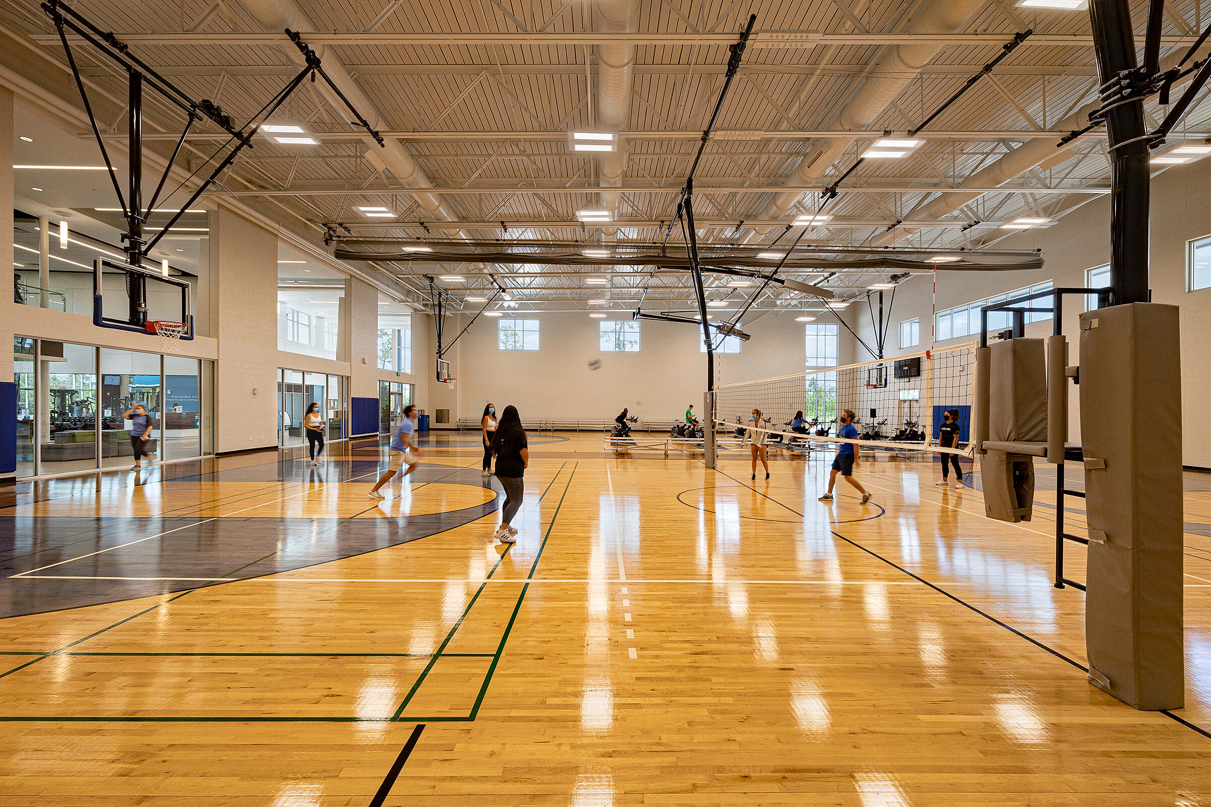 With its double-court layout, the gymnasium offers versatile space for a range of sports and recreational activities, including basketball, volleyball, and intramural events.