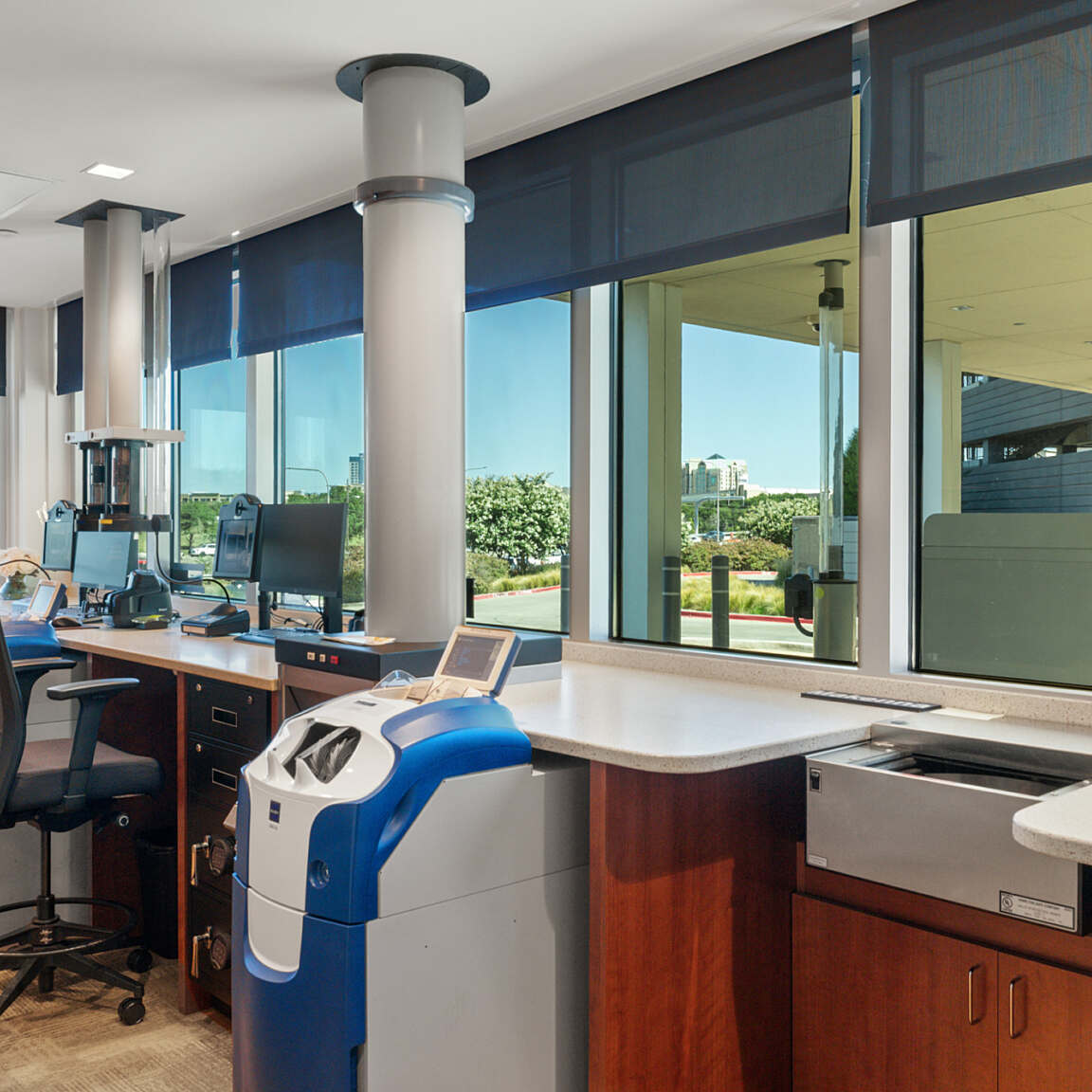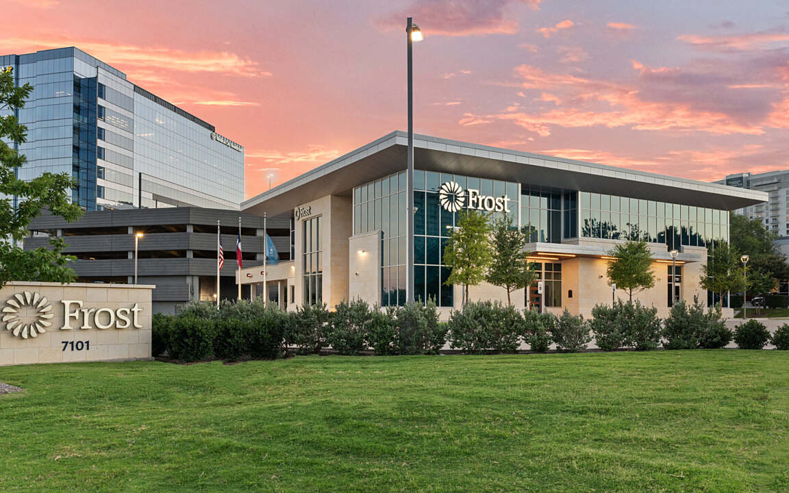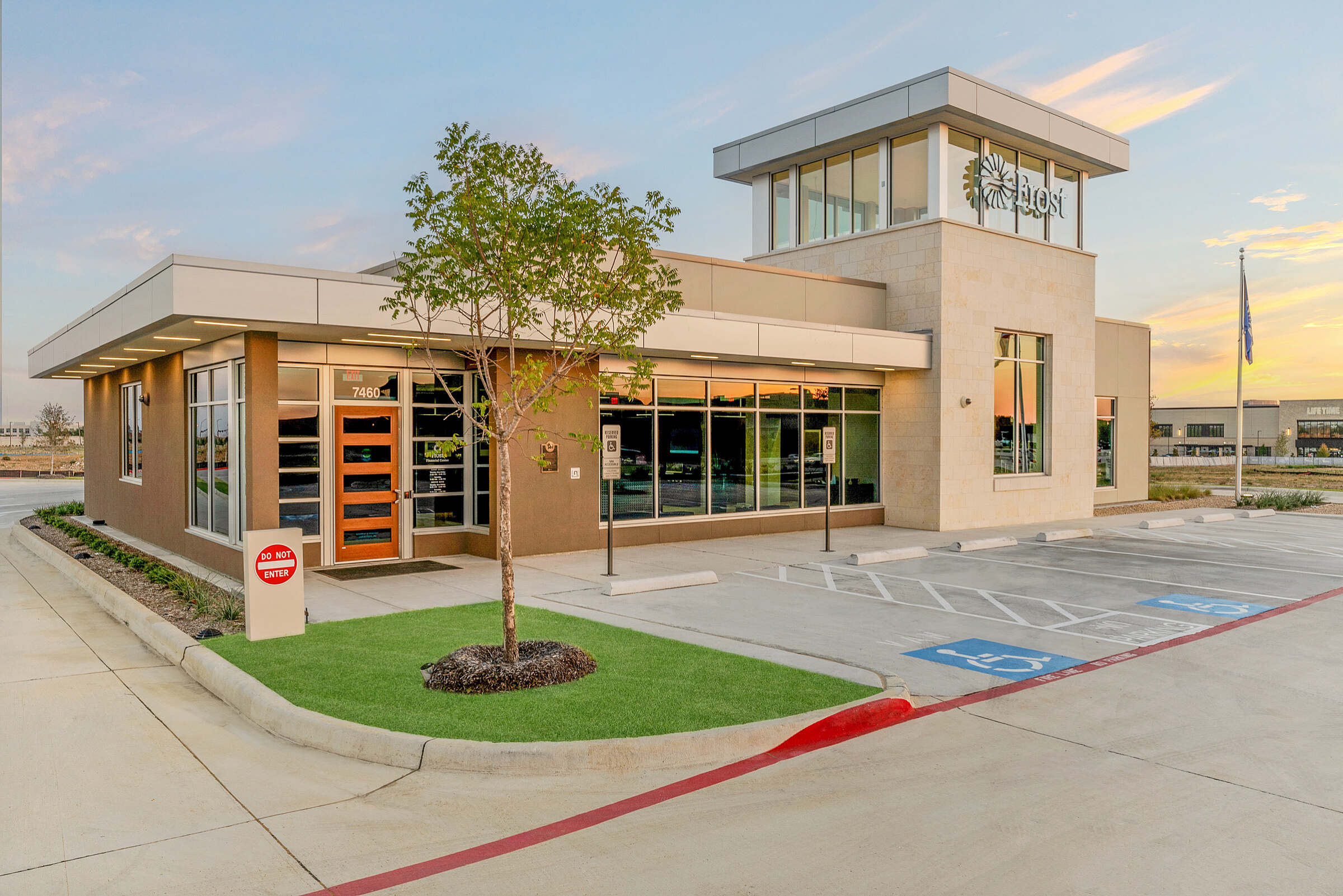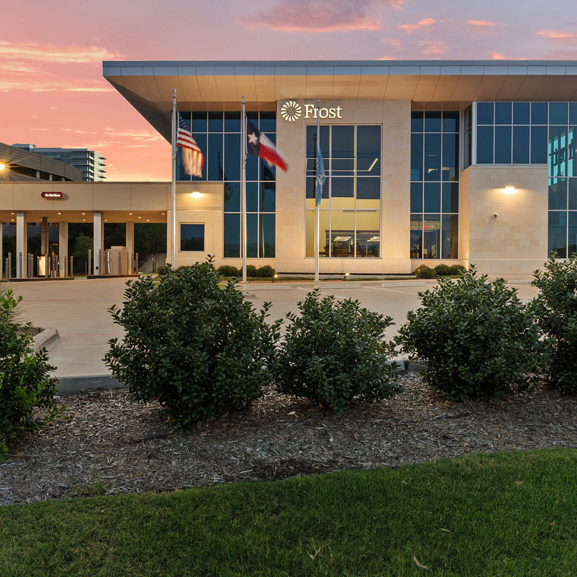 Designed to deliver a contemporary banking experience, this facility is anchored by the iconic Frost Tower—a vertical architectural statement clad in stone veneer, articulated with clerestory glazing, and crowned by a bold aluminum composite canopy that frames the main entrance. The building envelope features a balanced palette of dual-tone stucco and expansive glazing, harmonizing material contrast with generous natural light.