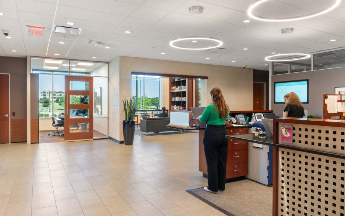 Responding to the Town of Frisco’s design guidelines, the architecture incorporates 80% exterior glass and a tripartite composition—defined by a base, middle, and crown—to bring order and proportion to the facades. Situated on a prominent corner along the North Dallas Tollway access road, the site presented multiple challenges including underground utility easements, right-of-way constraints, landscape setbacks, and traffic control devices, all of which informed the precise siting of new driveways and vehicular circulation.