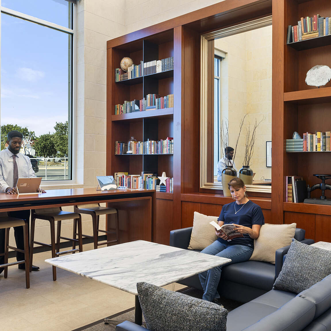 This bank's design is anchored by the visually prominent Frost Tower, establishing a strong architectural identity through its stone veneer cladding, articulated clerestory windows, and an aluminum composite canopy that defines the primary entry. The building envelope utilizes a refined palette of two-tone stucco and expansive glazing, creating a thoughtful interplay of solid and void that introduces rhythm, lightness, and visual transparency.