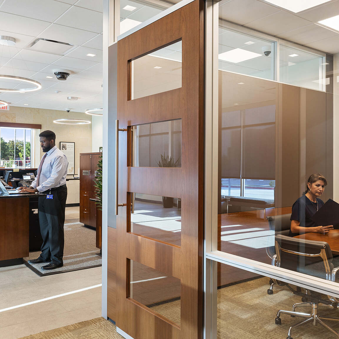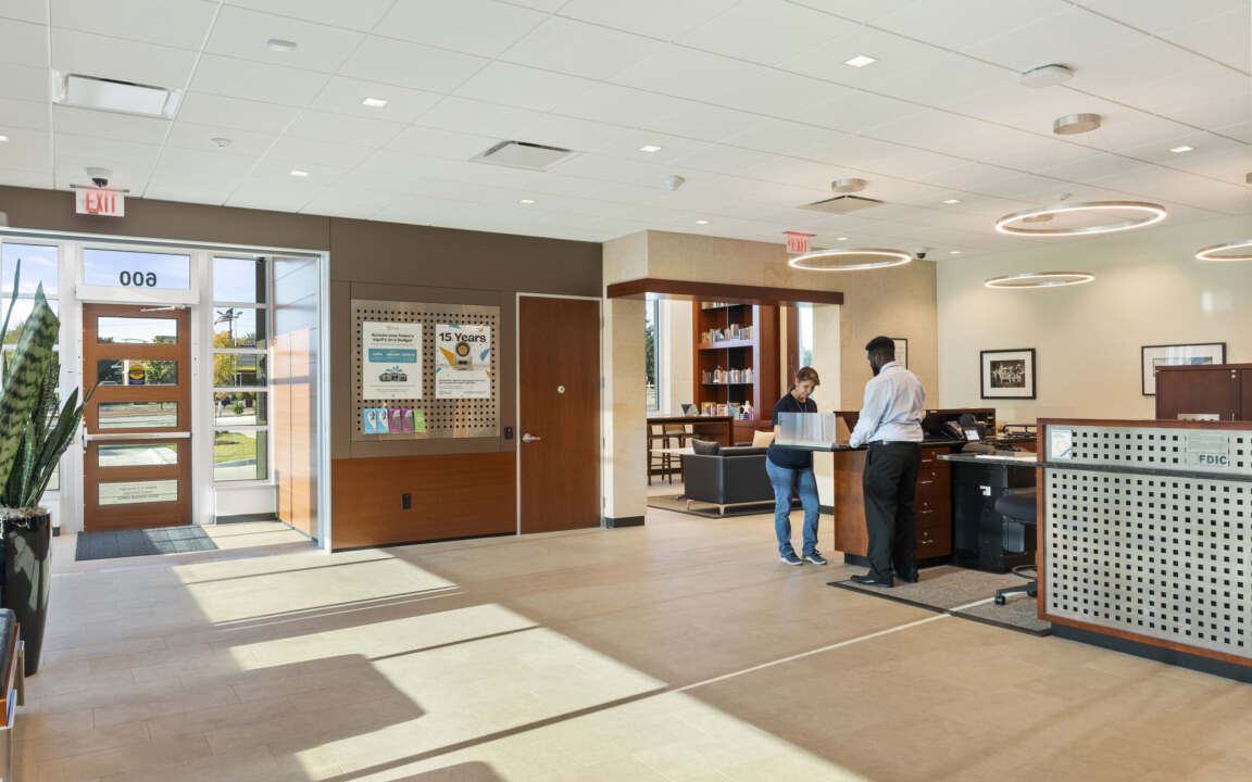 Inside, the layout is driven by spatial clarity and functional flow. A welcoming lobby connects directly to the Frost Room, with a progression of enclosed offices, open administrative workstations, and a centrally located conference room. The design integrates a shared work area, employee breakroom, and a full complement of support spaces—including IT/Security, custodial, storage, and restrooms—all supporting operational efficiency. Completing the program is a four-lane motor bank with integrated teller stations, extending the bank’s service offerings while maintaining architectural coherence from interior to exterior.
