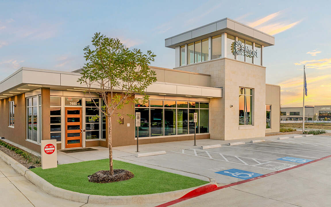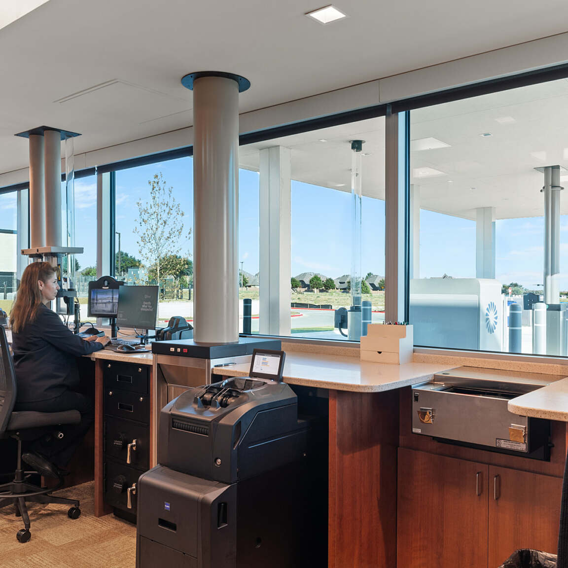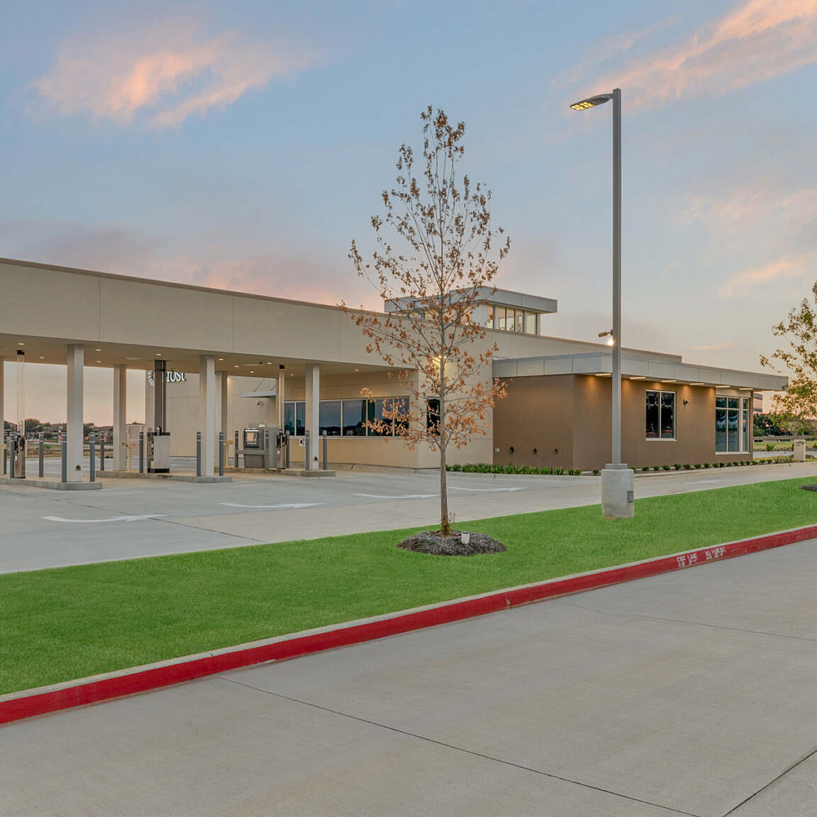 Frost Bank Las Colinas blends commercial and retail elements to serve the surrounding Irving community. The building balances functionality with architectural impact, featuring a bold 30-foot-tall limestone-clad tower that marks the entrance and conveys a sense of stability and distinction. Adjacent to the main structure, a four-lane motor bank extends services outdoors under a protective canopy, equipped with an ATM, transaction drawer, two 4-inch pneumatic tubes for personal banking, and an 8-inch tube designed specifically for commercial use.