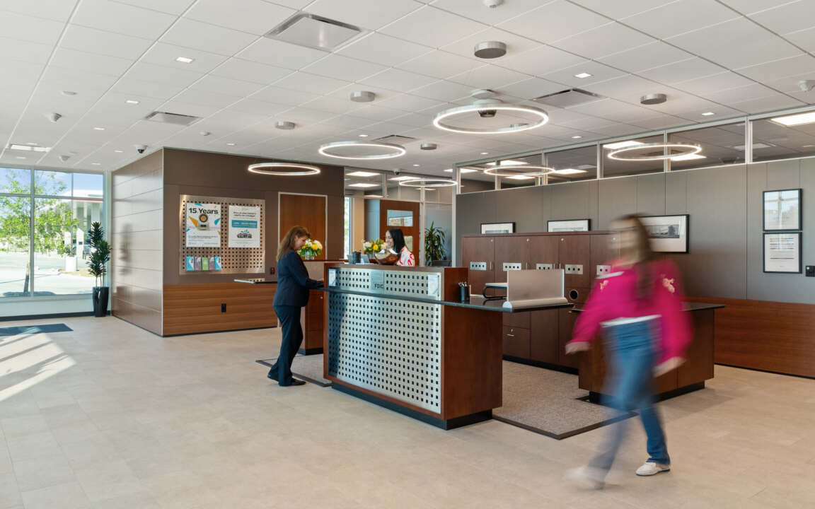 The interior of the bank offers a modern, open-concept layout that encourages customer engagement and a welcoming atmosphere. Departing from traditional teller lines, the lobby features a freestanding greeter station as its central point of contact, streamlining service while enhancing interaction. The space is thoughtfully programmed with two small conference rooms and one large conference room to accommodate a range of client meetings. In addition, the layout includes five private staff offices and a four-seat administrative workstation pod, promoting both efficiency and collaboration among bank employees.