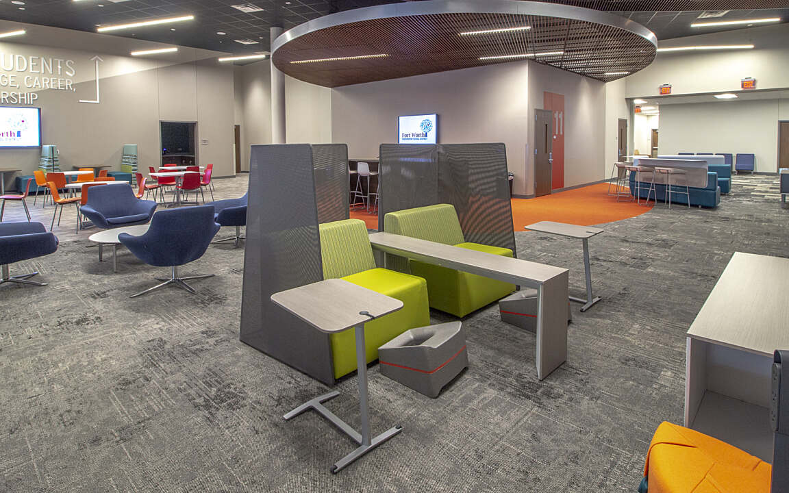 Teaching and Learning Center serves as a unified space for staff offices, classrooms, and an expansive training facility for principals and assistant principals. Coming from a repurposed large-scale food store, the layout includes first-floor perimeter offices, a mezzanine office space above smaller classrooms, and standard-sized classrooms equipped with flexible furniture layouts, advanced audio/visual gear, and distance learning capabilities. At the heart of the center is a divisible training room accommodating 766 people, offering diverse seating and presentation options, complemented by full A/V capabilities that can be combined into a large meeting space. Emphasizing a vibrant and invigorating environment for teacher training, the project incorporates innovative design, new furniture, and state-of-the-art technology, fostering collaboration and breakout spaces for both groups and individuals. Notably, the exterior front facade underwent a substantial redesign, shedding its grocery store identity to embrace a new, distinctive image for Fort Worth ISD.