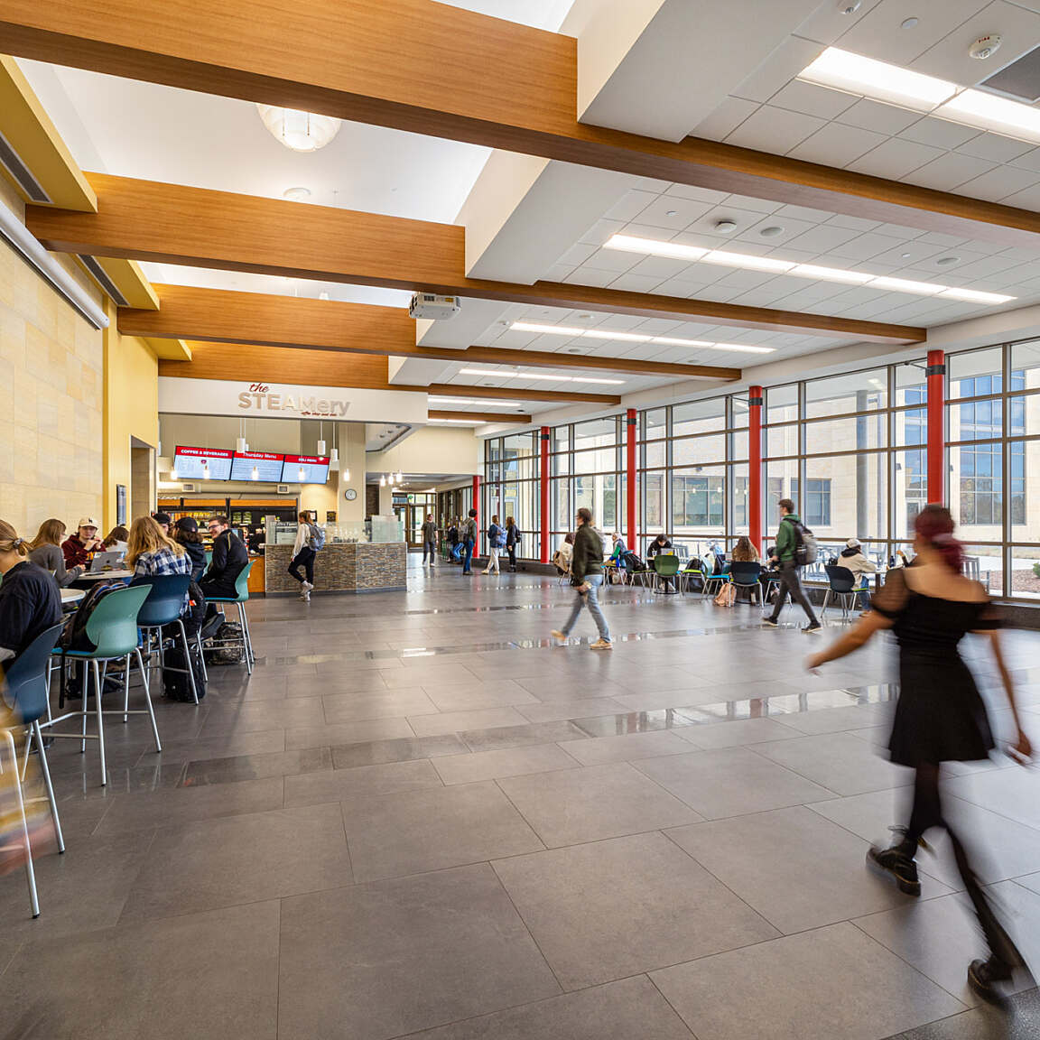 Nobel Hall’s revitalization also involved adaptive reuse of the existing two-story Wallenberg Auditorium and the greenhouse above. These areas, which were windowless and centrally located, were replaced by a new three-story student commons. This addition brings natural light deep into the core of the building, enhancing the space and creating a more inviting atmosphere. The facility is LEED Gold Certified, making it 20% more energy efficient than comparable buildings. Sustainable features include the use of regional and recycled materials, water use reduction methods, and energy-efficient LED lighting fixtures.