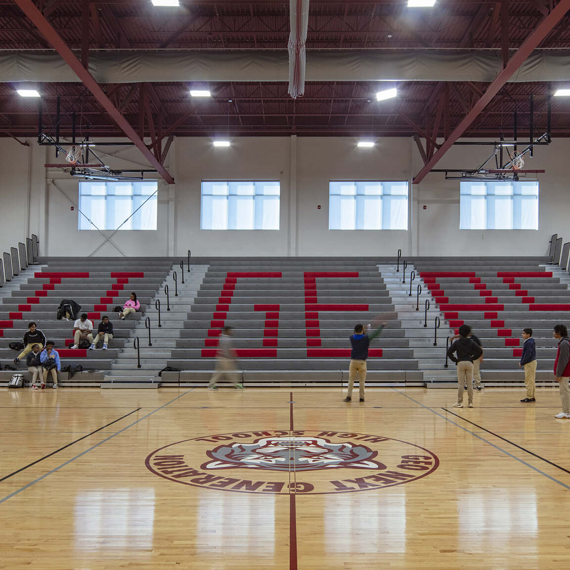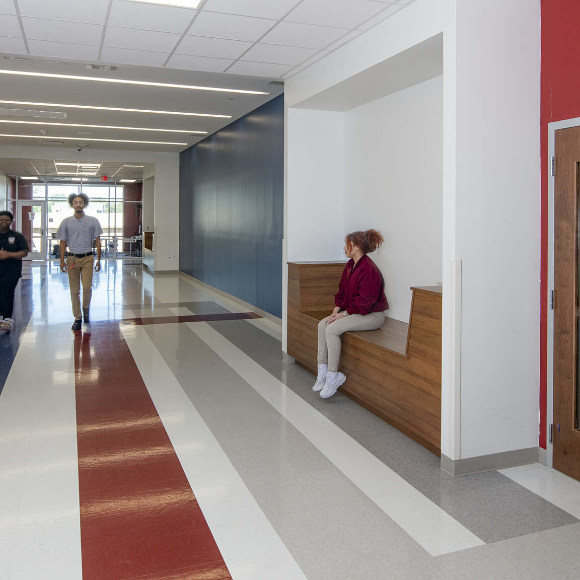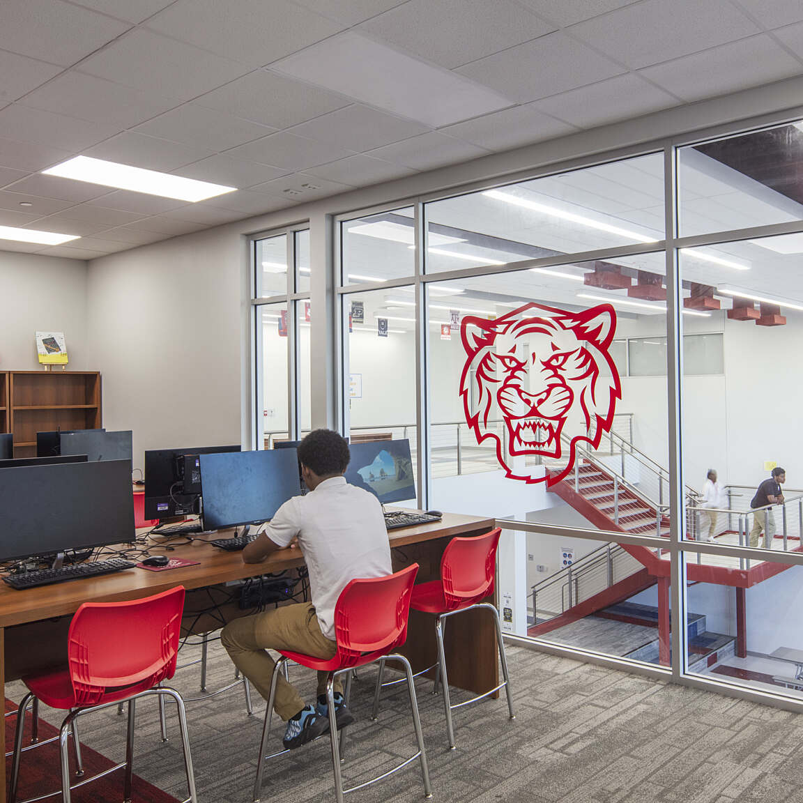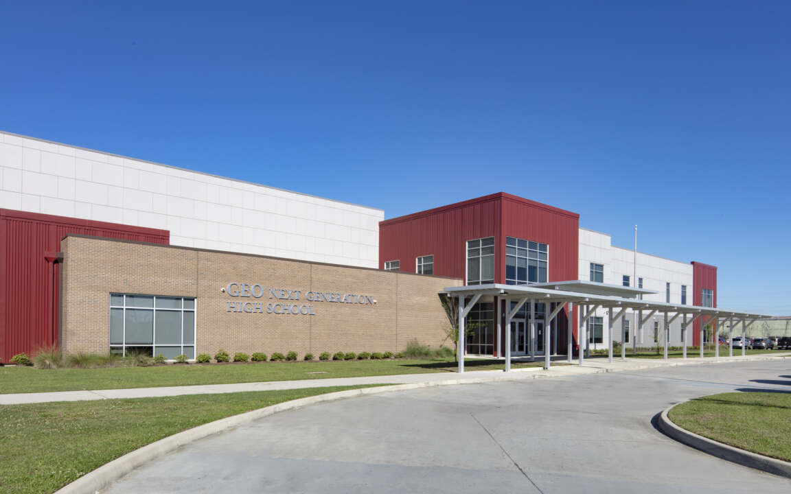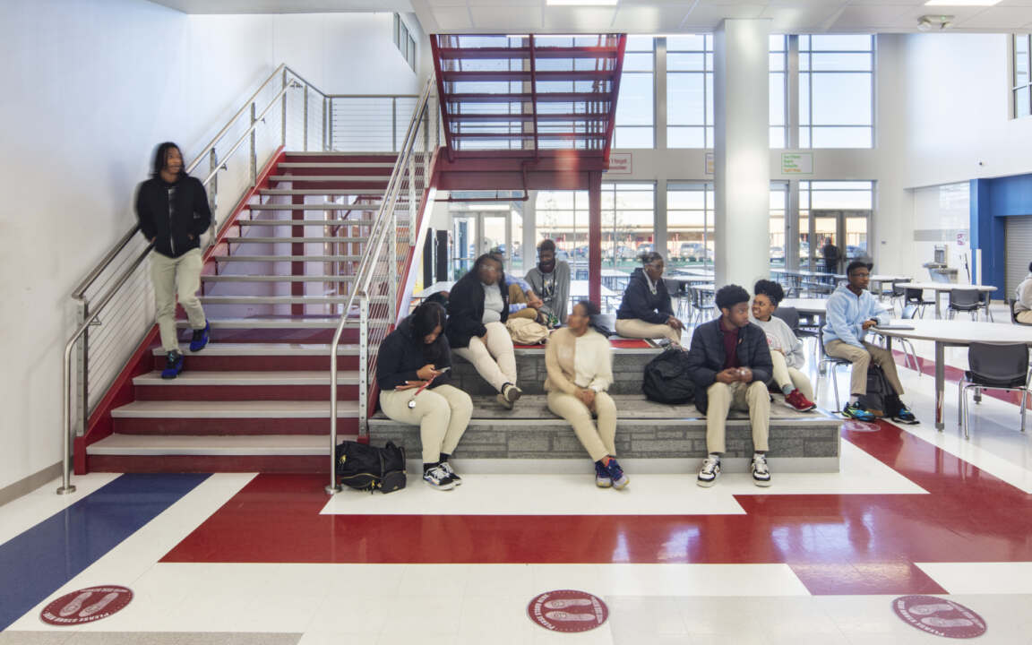 GEO Next Generation High School serves 600 students. Media lounges and focus spaces are dispersed throughout the school to accommodate flexibility for students’ staggered schedules in a curriculum which rotates students from campus to a local community college for classes.