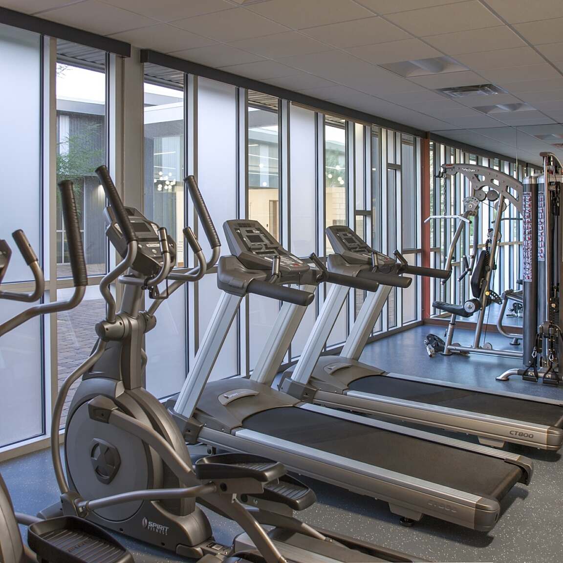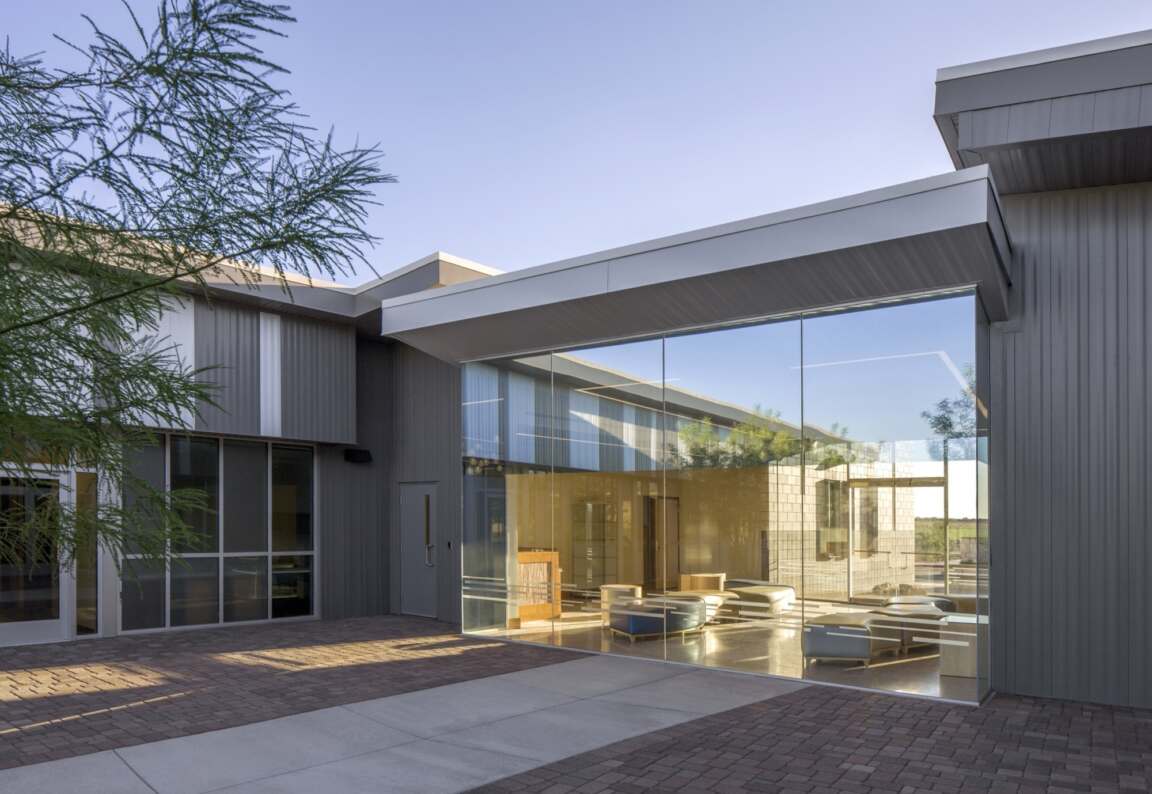 Large, floor-to-ceiling windows are featured throughout the facility, allowing natural light to fill the interior spaces. These expansive windows also provide clear views of the surrounding area, creating a calming environment for the residents.