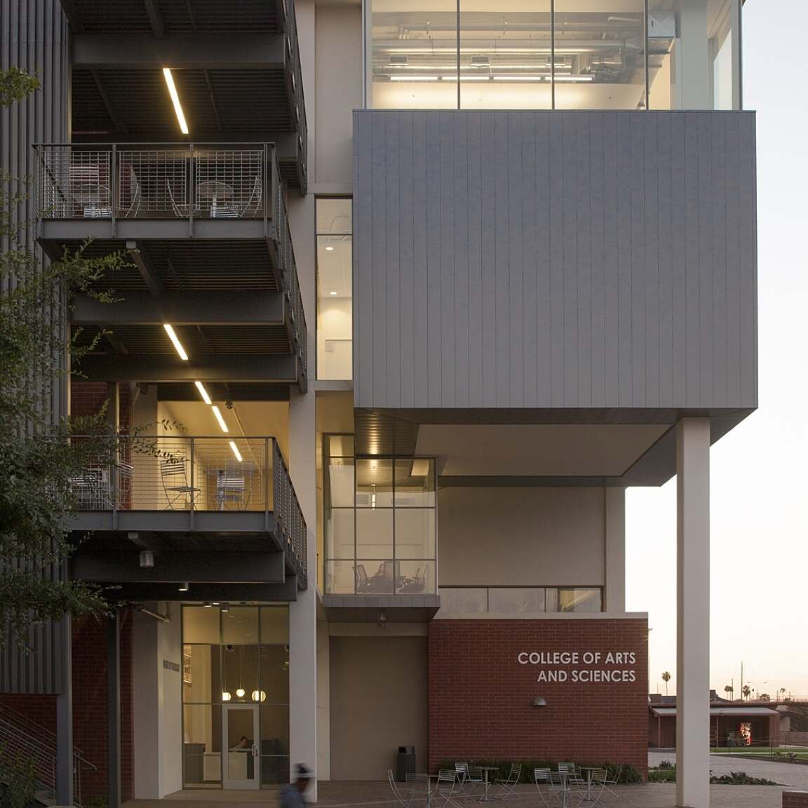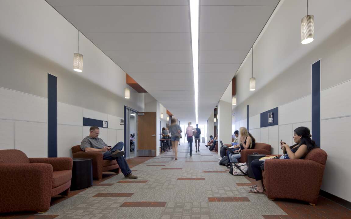 The four-story building seamlessly integrates into the modern campus, aligning with the university's values while acting as a central hub for the community. Its design reflects the evolving nature of the campus, creating a space that not only serves educational needs but also functions as a "stopping point" for both students and faculty. The mix of uses within the building ensures it becomes a destination where diverse activities and learning experiences can take place.