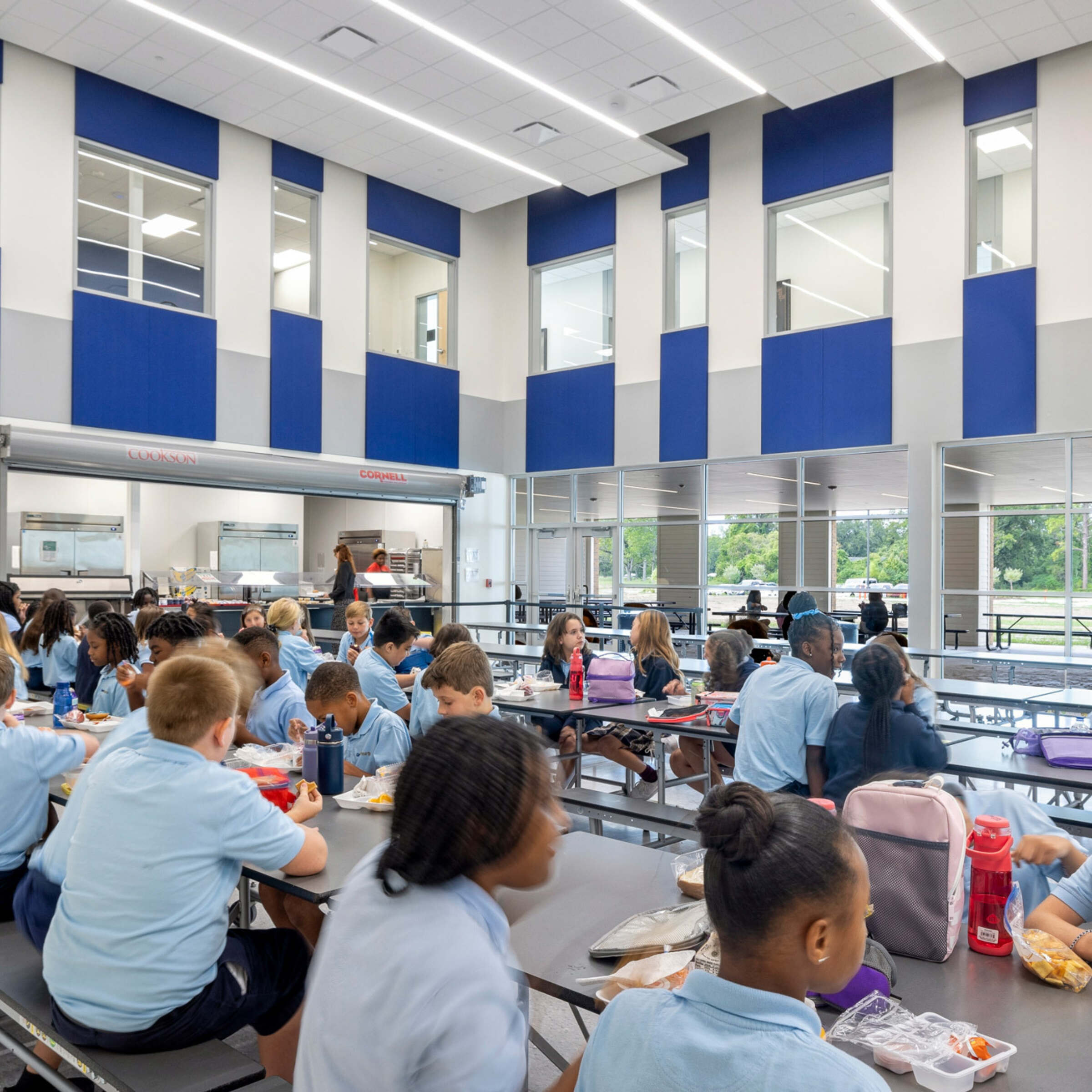 Within the building, students are greeted with generously sized classrooms, specialized spaces for art and music instruction, a spacious multipurpose room (MPR), and a fully equipped gymnasium boasting a competition-level basketball court. There is also a stage that serves as the epicenter for school assemblies and performances, fostering a strong sense of community and creativity. An outdoor covered terrace adds an element of nature and the outdoors to the school's offerings, creating a space where students can unwind and engage with the environment.