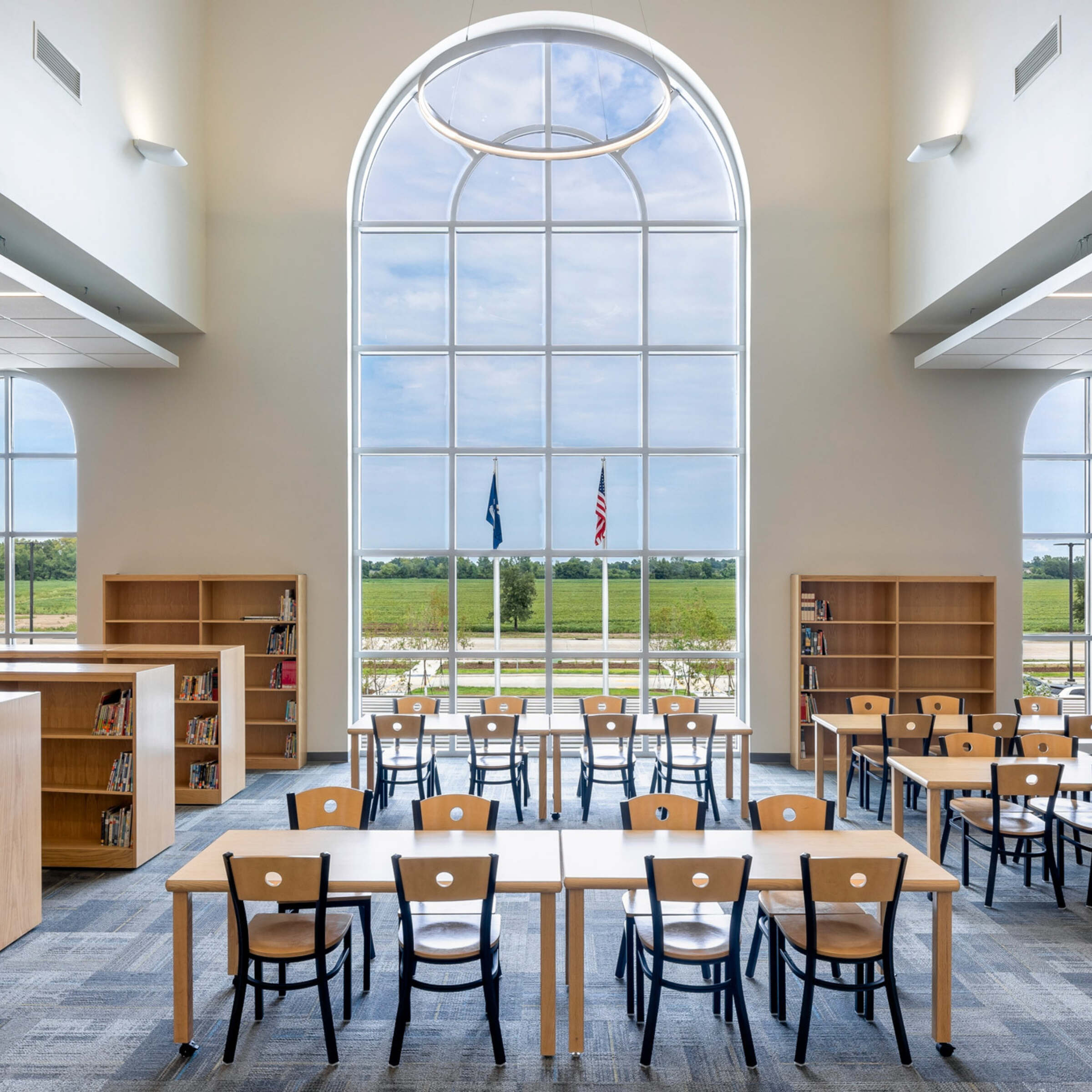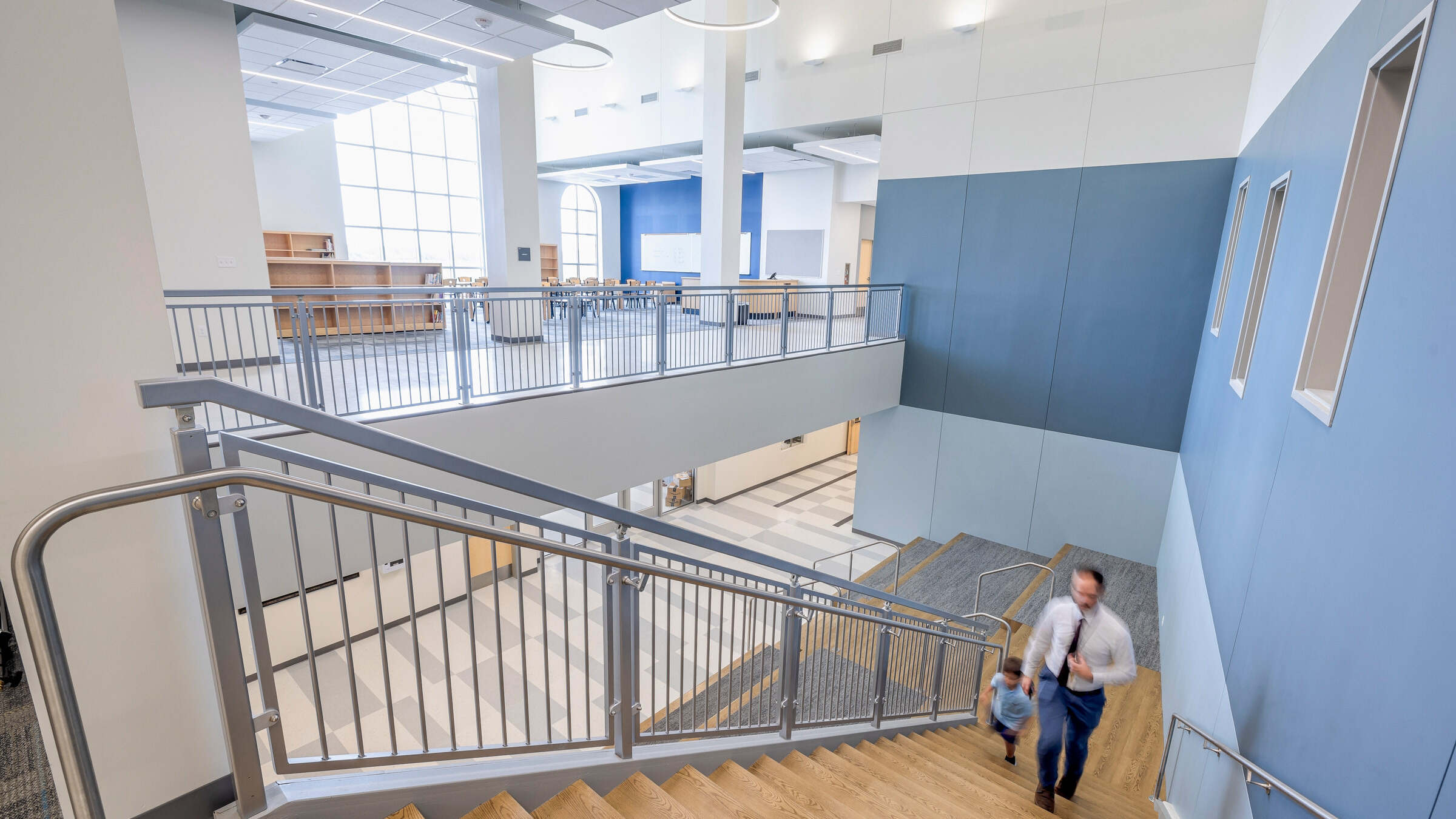 Great Hearts – Harveston has a classical approach to education, rooted in real and meaningful content that traces its sources through the peaks and pitfalls of the Western tradition. Students learn about historical events, literary characters, stories, poetry, scientific facts, and mathematical proofs. This philosophy inspired the classical architectural elements on the exterior of the building and also influenced the planning so that the learning stair and library serve as the heart of the campus.
