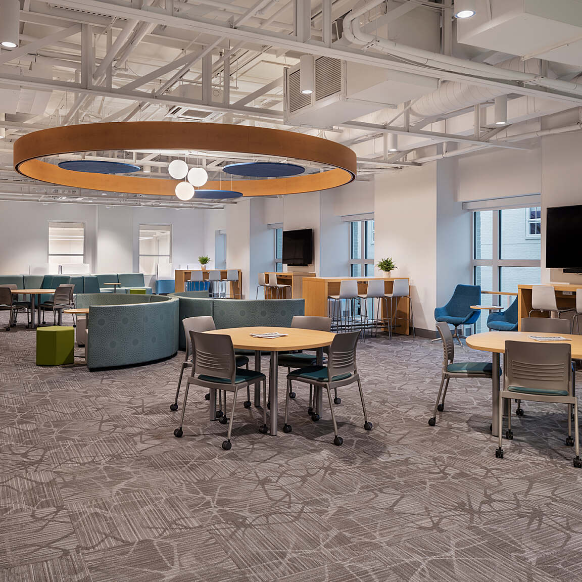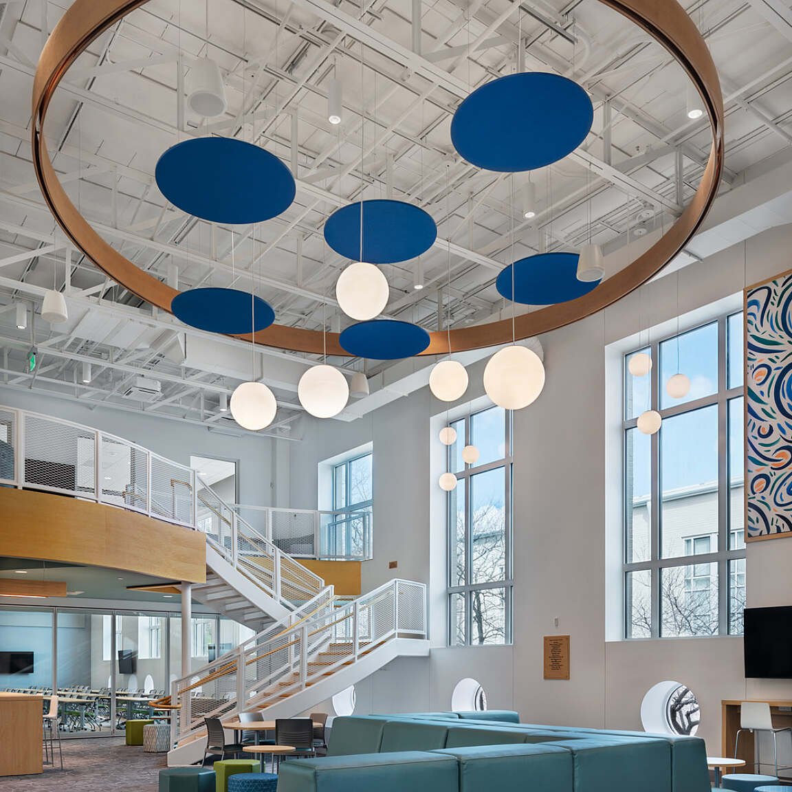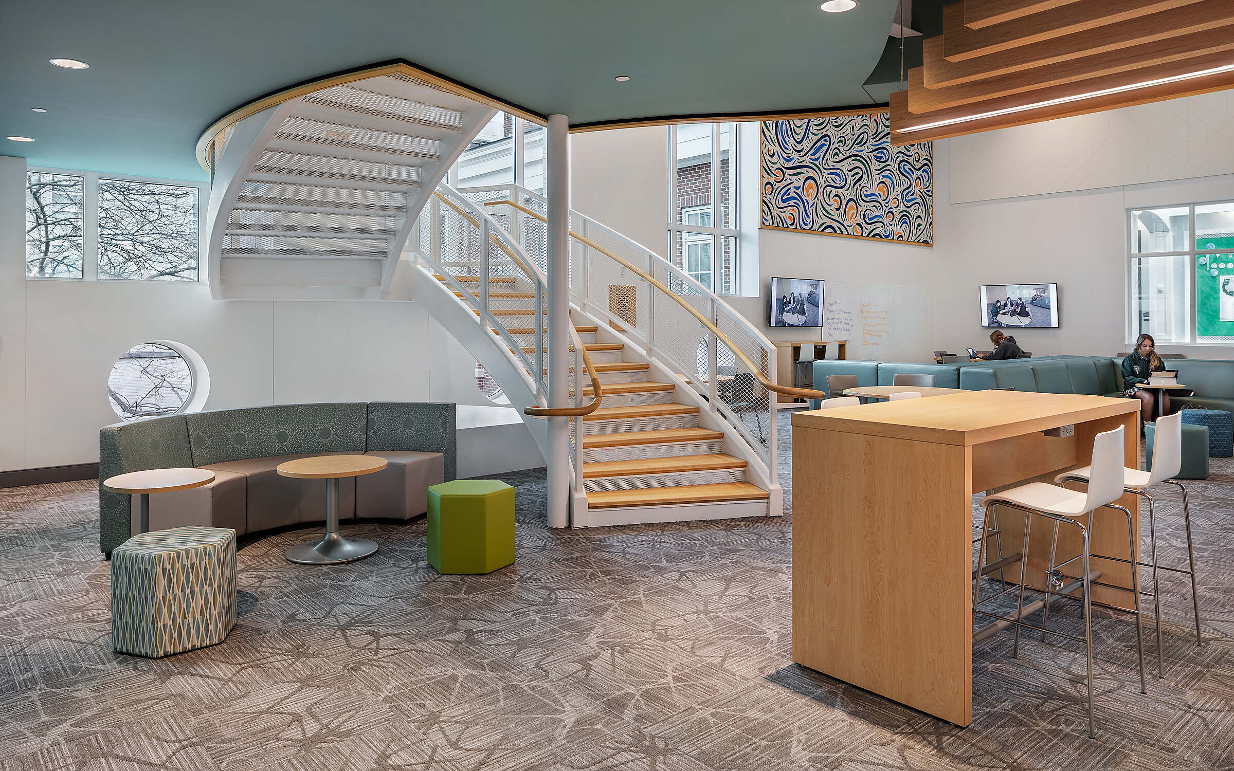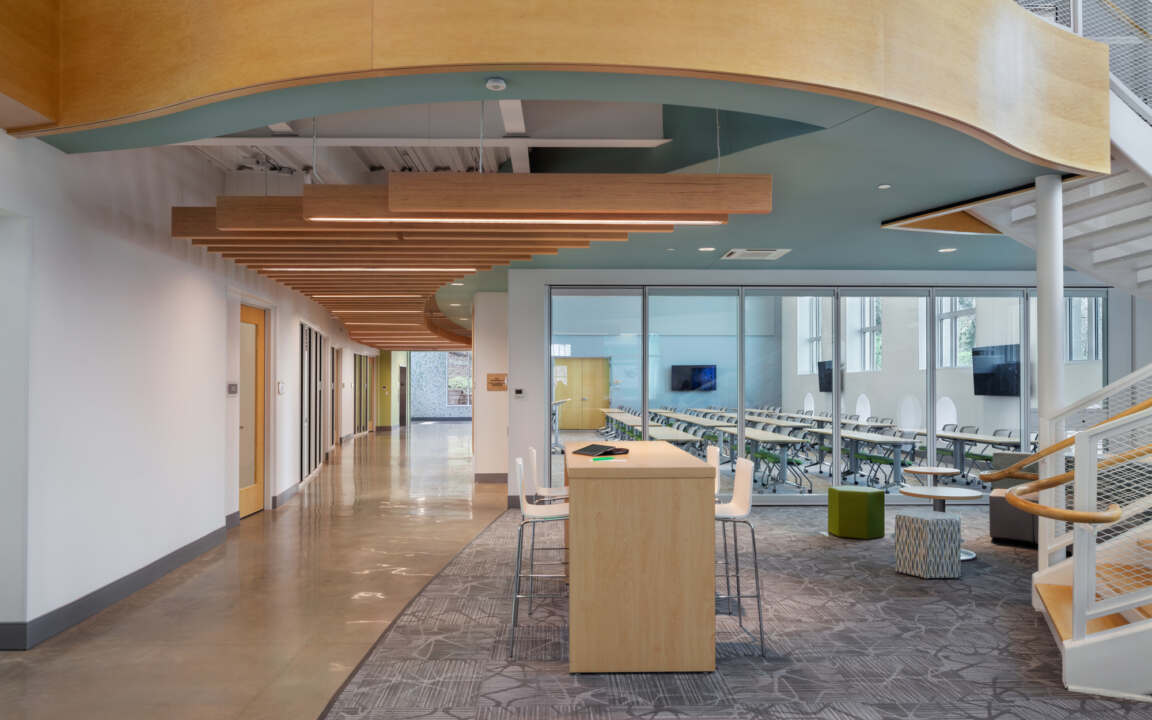 Flexibility is a core principle of the Lab’s design. Acoustic considerations were carefully addressed to support a range of simultaneous activities, and spaces are outfitted with markable and tackable walls for brainstorming and display. Moveable furniture and operable walls allow the layout to adapt easily for different needs—from small group collaboration to large presentations. The Lab’s unique mix of learning environments includes a maker space, robotics classroom with a retractable field, a green-screen podcast studio, a teaching kitchen, a cozy loft and study space, and a lecture hall that seats 125 people.