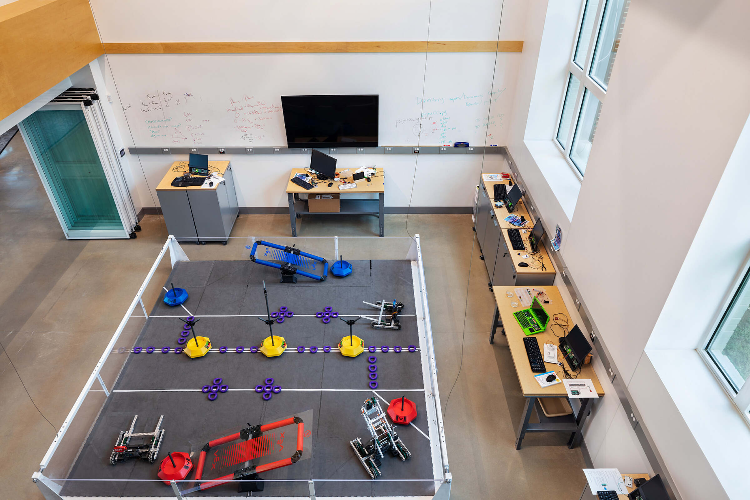 The innovative classrooms are designed to foster creativity and collaboration, equipped with flexible layouts and technology to support a variety of learning styles. The robotics room, featuring a retractable field, provides students with a hands-on space to explore robotics and engineering concepts through interactive, real-world applications.