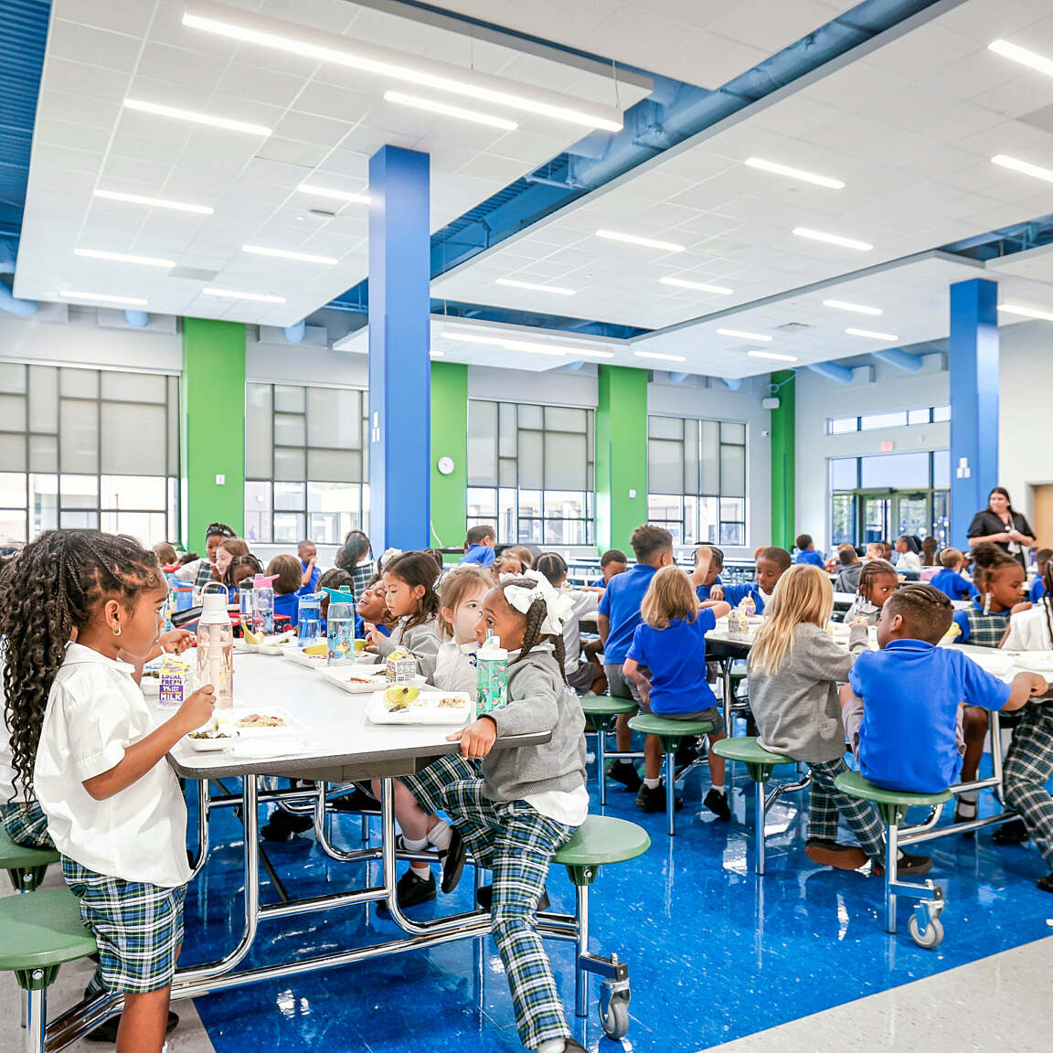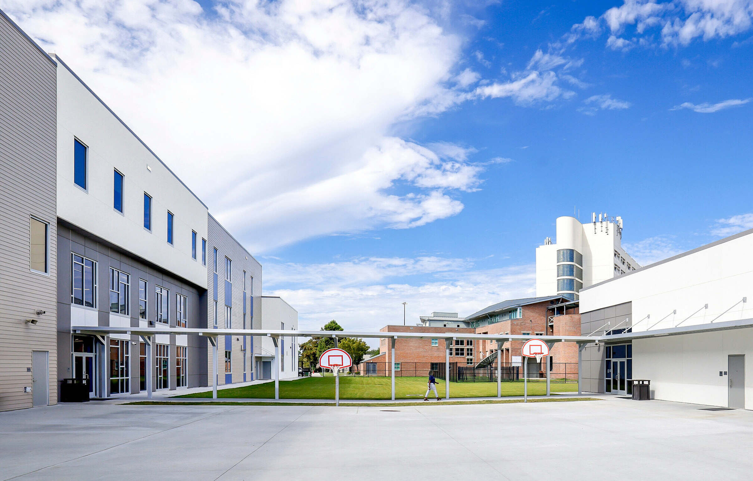 Diagrammatically, the school is divided into two buildings. The south building houses administrative offices, classrooms, special education, and media center spaces. Meanwhile, the north building contains enrichment classrooms and commons areas. The two structures are connected by a secure covered pavilion that facilitates learning activities as well as movement between buildings.