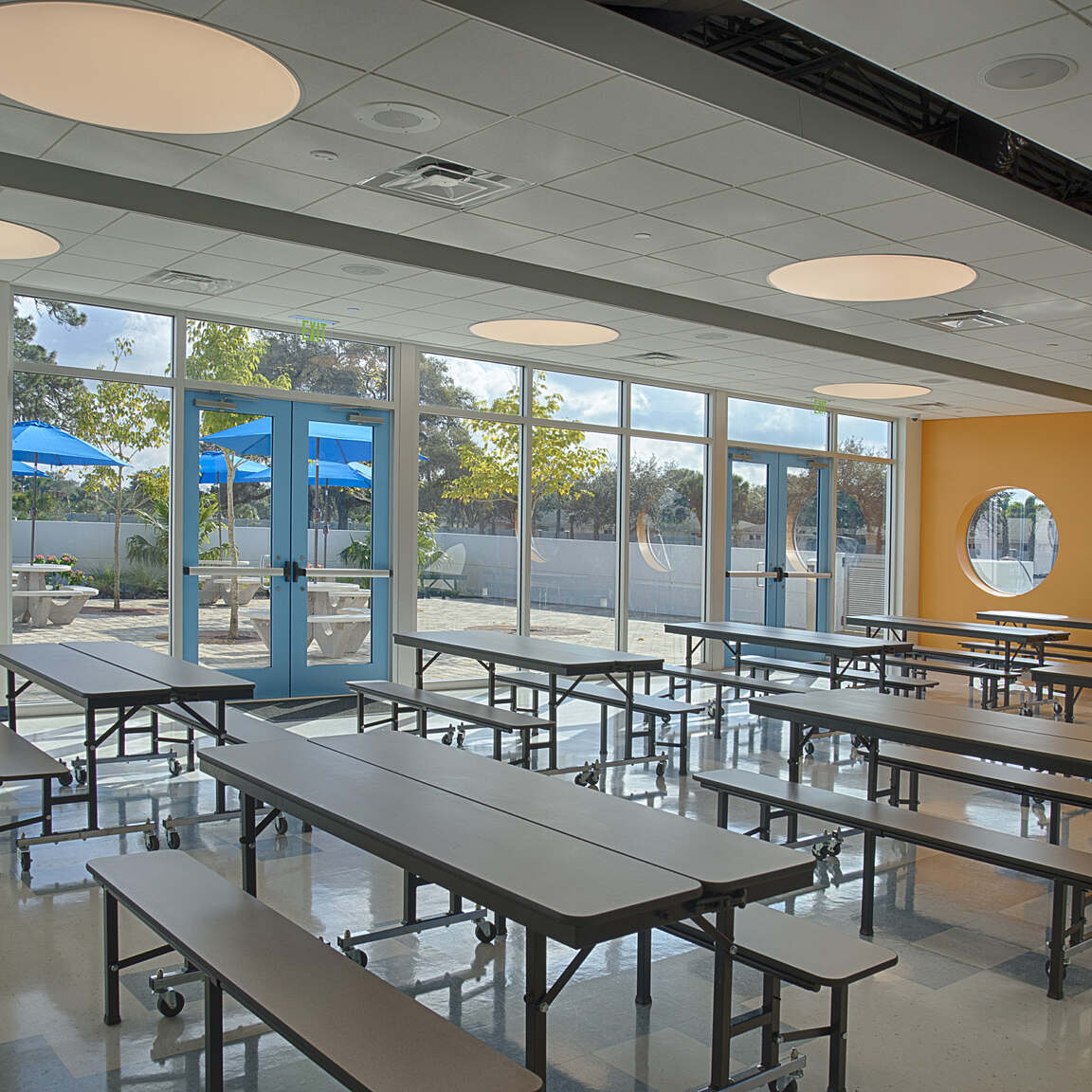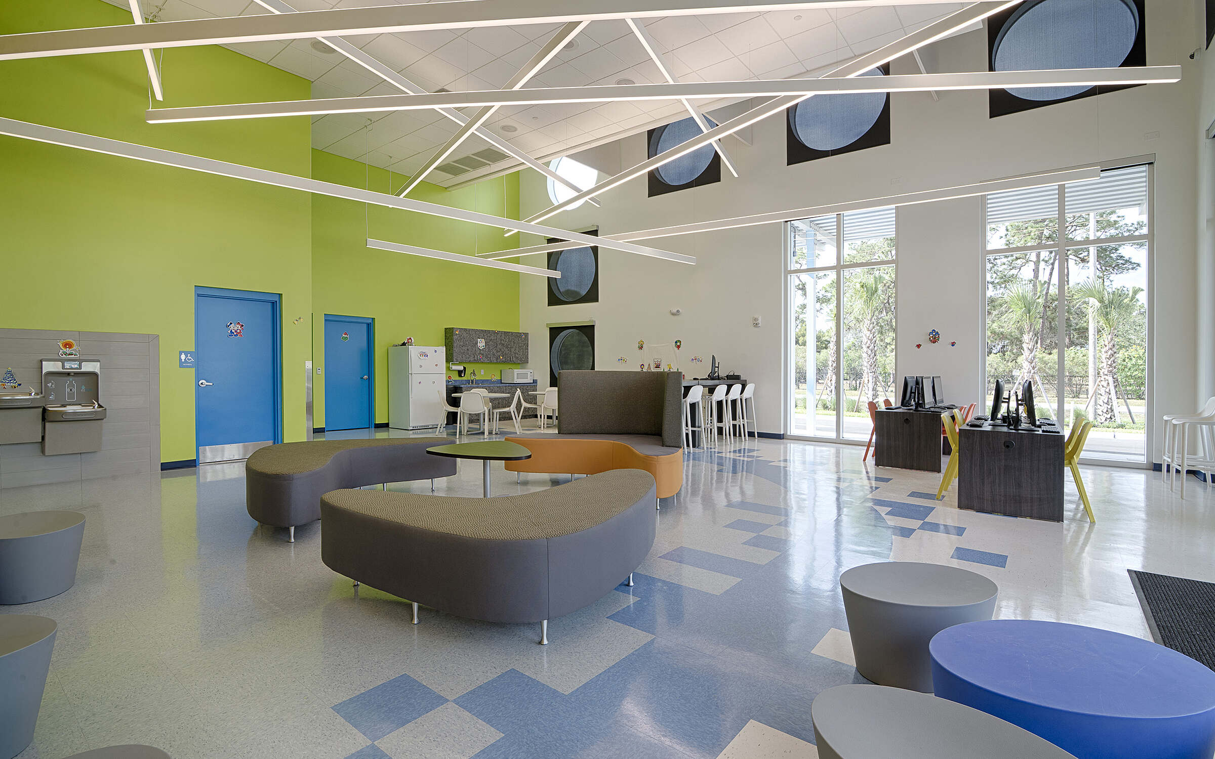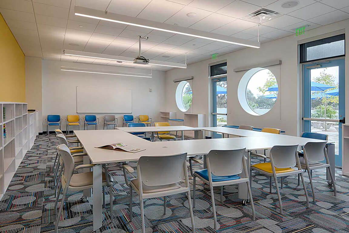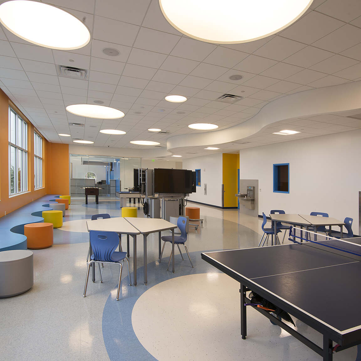 Circle windows, consistently used throughout the project, mimic those of a sister facility, offering simple and memorable imagery for the children and young adults. This design element serves as a metaphor for the infinite possibilities that education can provide to young minds.