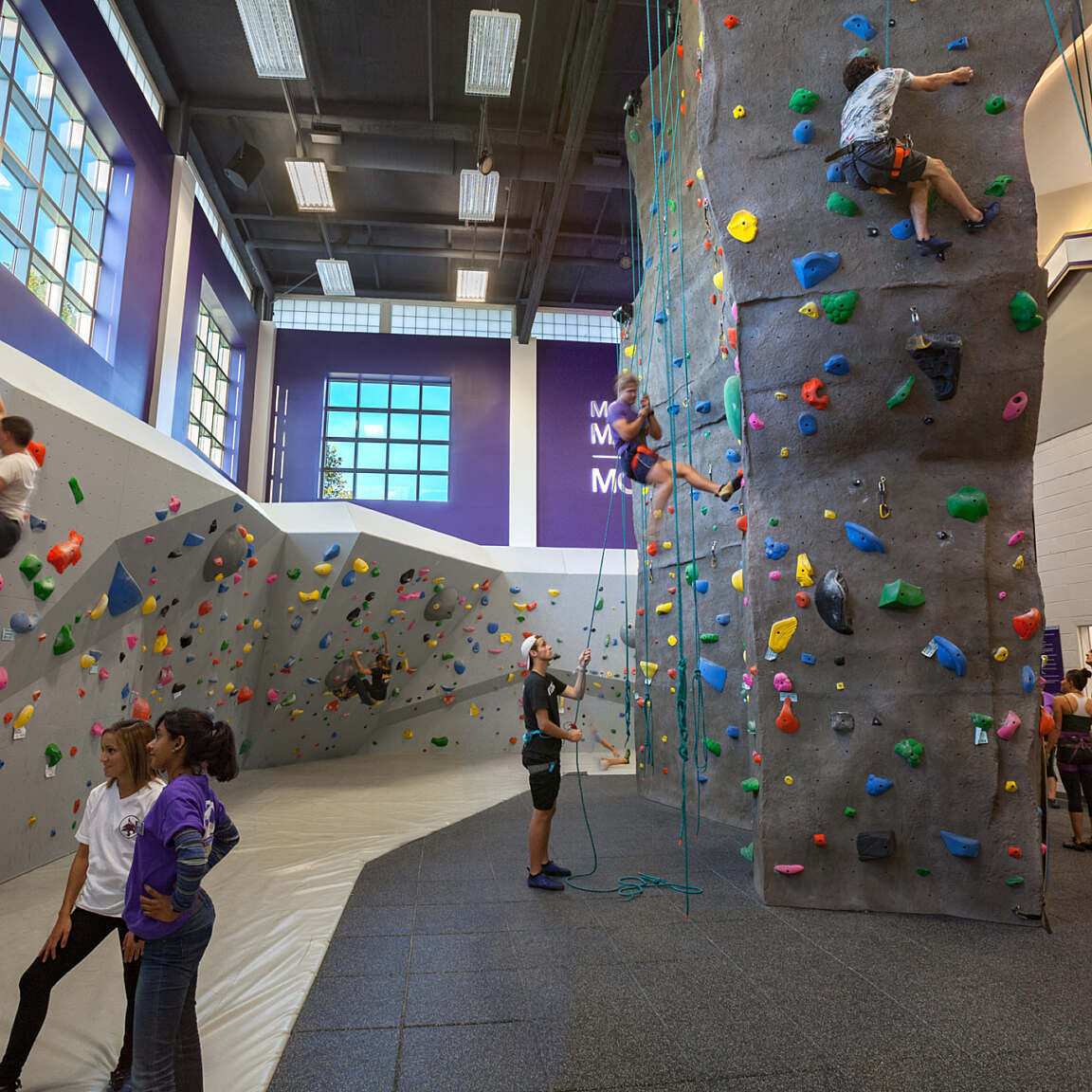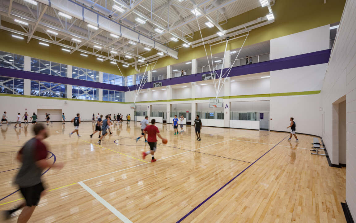 The addition includes weight, fitness, and cardio areas that are over twice the size of the original, five flexible group fitness studios, two multi-activity courts, a two-court recreation gym, and a 1/6-mile, four-lane indoor running track. New amenities also include a wellness suite, outdoor adventure area with a climbing wall, and an instructional pool with a current channel and whirlpool.